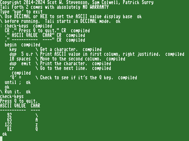 There are no BRK instructions in Tali itself except for one in the word BYE, but I believe the unused areas in the bin file are zero filled so those will show up as BRK if you accidentally try to run code there. That reminds me - I believe you end up in a series of BRK instructions if the CPU is a ...