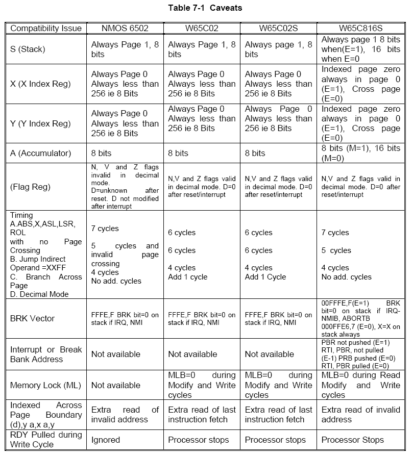 Does anyone know of a web page showing the differences between the NMOS 6502, the 65c02, and the '816? I have everything on paper, in different books and appendices and ap. notes, and various links, but there ought to be a single web page showing all of it in one place: