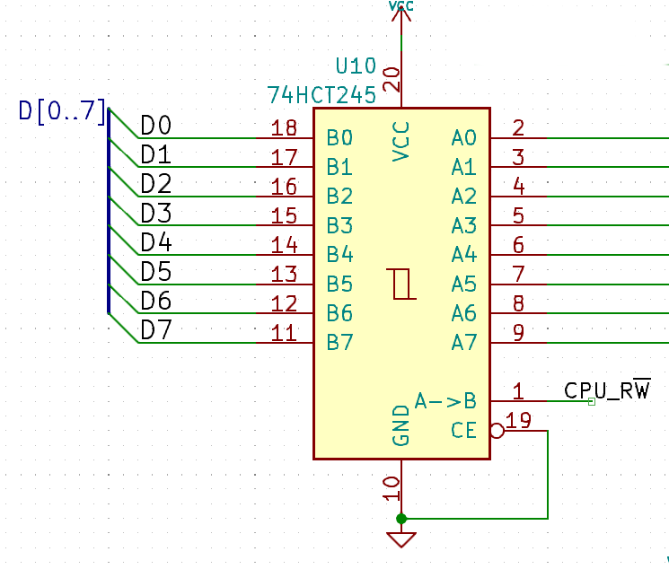 And that's where I screwed up. The experienced viewer will notice that I tied the /CE pin for the data bus buffer to ground, having it drive the bus when r/w is high.