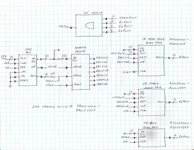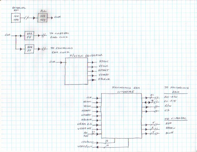 The idea for the 'initial' operation is for the CPU to be able to read and write to the external synchronous RAM during the horizontal and vertical retrace periods. All the square blocks will be the individual Verilog modules, although I may have to add another module to accommodate the bidirectional data bus of the SRAM. Also, I expect the timing will be off as I use a common clock for everything, with no provisions for the delay of the FPGA and SRAM, but I would expect to see some recognizable activity if the .b core software is actually running. I will just try to clear the video RAM for the first test.