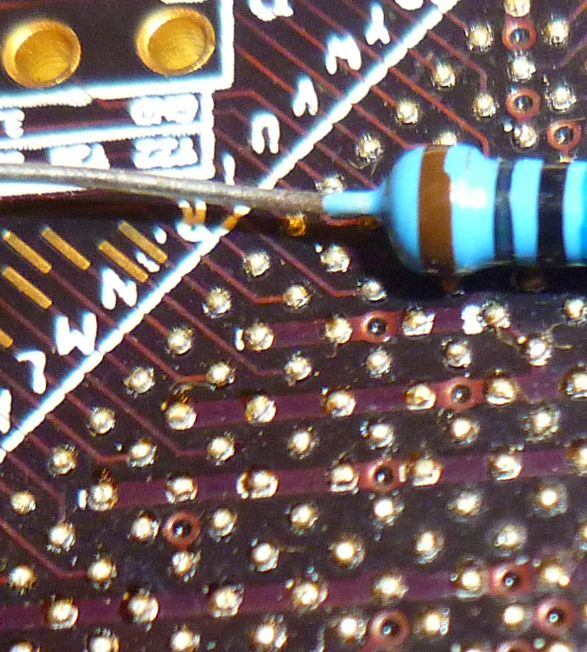 Here is a close-up of a failed board with a little resistor for scale. You can see the power distribution buses under the mask, and get a sense of the vias. Note that on my board I did not need that many IOs - I connected an SRAM and every pad of the 6502, a 44-pin connector (a few pins for power) and two 'butterfly' connectors with 4 extra IOs, and have a dozen spares connected to tiny pads. All using the top layer. Only a few special connections (JTAG, power, clocking, configuration) are routed to the bottom.