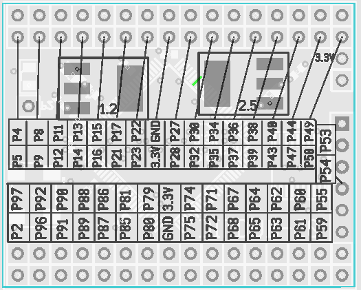 The only parts on the bottom are the two voltage regulators for 2.5V and 1.2V required for the FPGA operation. There is also a handy chart of the pin assignments. The bottom rows of the legend are aligned with the pins (one pair is above on the right since the power connector is blocking the spot where it would go). The top legend has lines to clearly indicate which row belongs to what pins.