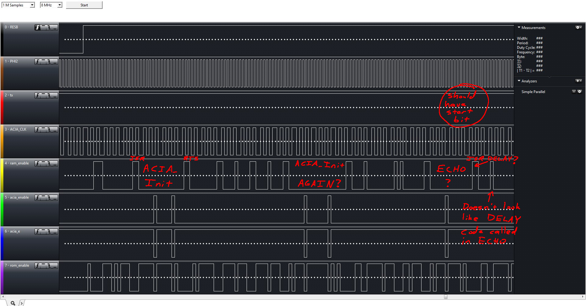 Later I see an acia_enable access that could be ECHO, but ECHO calls Delay right after sending the byte to the ACIA, and Delay pushes three registers right at the beginning, so I would expect to see ram_enable pulses 3-5 cycles apart and there is only a single pulse near the end of the trace and too many clocks with no ram_enable for it to line up with that code.