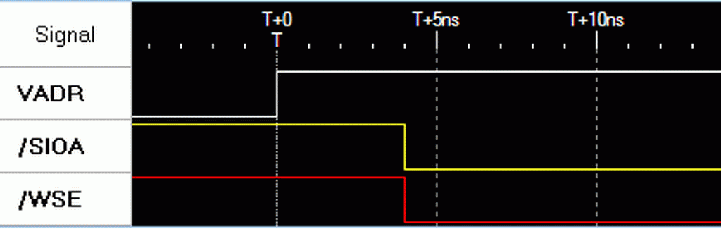 As can be seen, both /SIOA and /WSE apparently became true only 4 nanoseconds after VADR became true.  I say “apparently” because the logic analyzer’s maximum resolution is 2ns.  The GAL acting as the guinea pig is guaranteed to have 7.5ns pin-to-pin performance, which is possible in this case because all logic is combinatorial and doesn’t use any pins as nodes.  Hence the above capture implies that the logic analyzer is being optimistic about the guinea pig’s performance.  More likely, the switching speed is at least 5ns due to logic analyzer fudging.  Or...it could be 3ns, which is listed as a TPD minimum in the data sheet for simple, combinatorial logic—but seems very unlikely.  Either way, performance when compared to what would be achievable in equivalent discrete logic is excellent.  :D