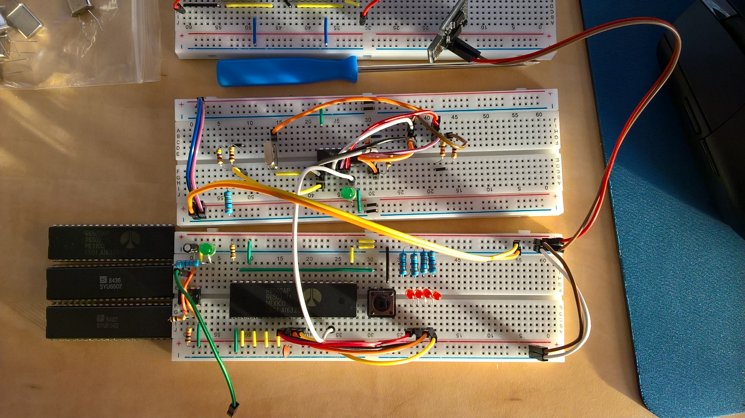 I bought a few 6502 CPUs on eBay. I have two 6502 units by Rockwell and two by Synertek. I have hand wired the CPUs and tried them with 555 timer, but later I found out that the pulse from 555 timer is not fully compatible with 6502. I know, that Synertek CPUs had built-in clock generators, so I have tried these CPUs without any external clock generator. Unfortunately I didn't get any result, any of LEDs connected to 16-bit address bus didn't shine. I have also tried connecting data bus to ground and 5V with 1k resistors to simulate RAM. So then I connected crystal oscillator circuit according to R6502AP datasheet. (see attachment) Synertek CPUs did not show up any artifacts of life, however, both processors have warmed up slightly. One of Rockwell 6502AP units, connected with CMS 1.8432 MHz crystal circuit, showed up some artifacts of life, a few random LEDs were shining. Other LEDs began to light up after the reset, but they never shone all. I expected every LED to shine. What could be wrong? Crystal generation circuit and connections in general should be okay.