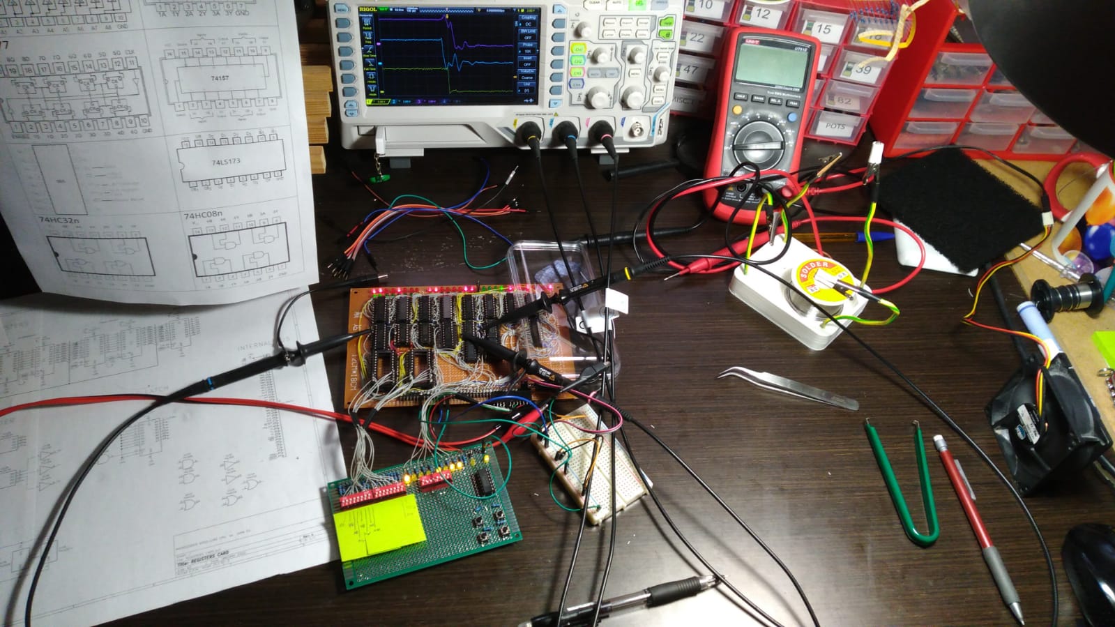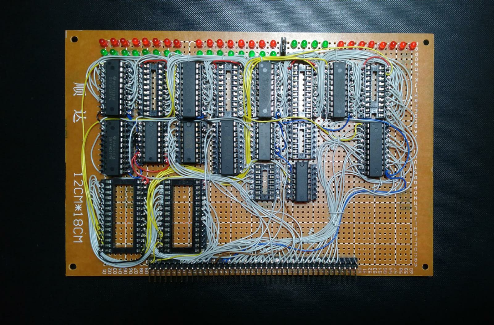 Here is the registers card. It's missing some ICs that are still on the way, but otherwise its complete. Wiring is fiddly, but it can be done, and not having to flip the board over helps a great deal. Power and LEDs are wired on the underside though. Debugging is going to be a nightmare...