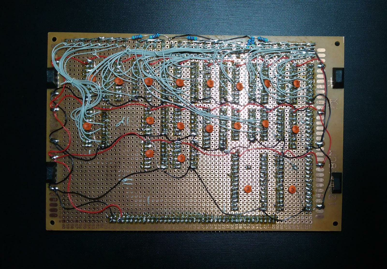 I don't think ground distribution is good enough. Ground and power are routed on the underside using wire wrapping wire (see photos some posts above). Maybe I should re-do it with thicker wire.