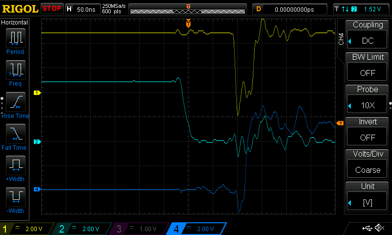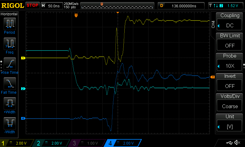 It may be due to power distribution (using quite long leads from the power supply at the moment), so I added 100 uF electrolytics to each of the cards, but the glitch still occurs.