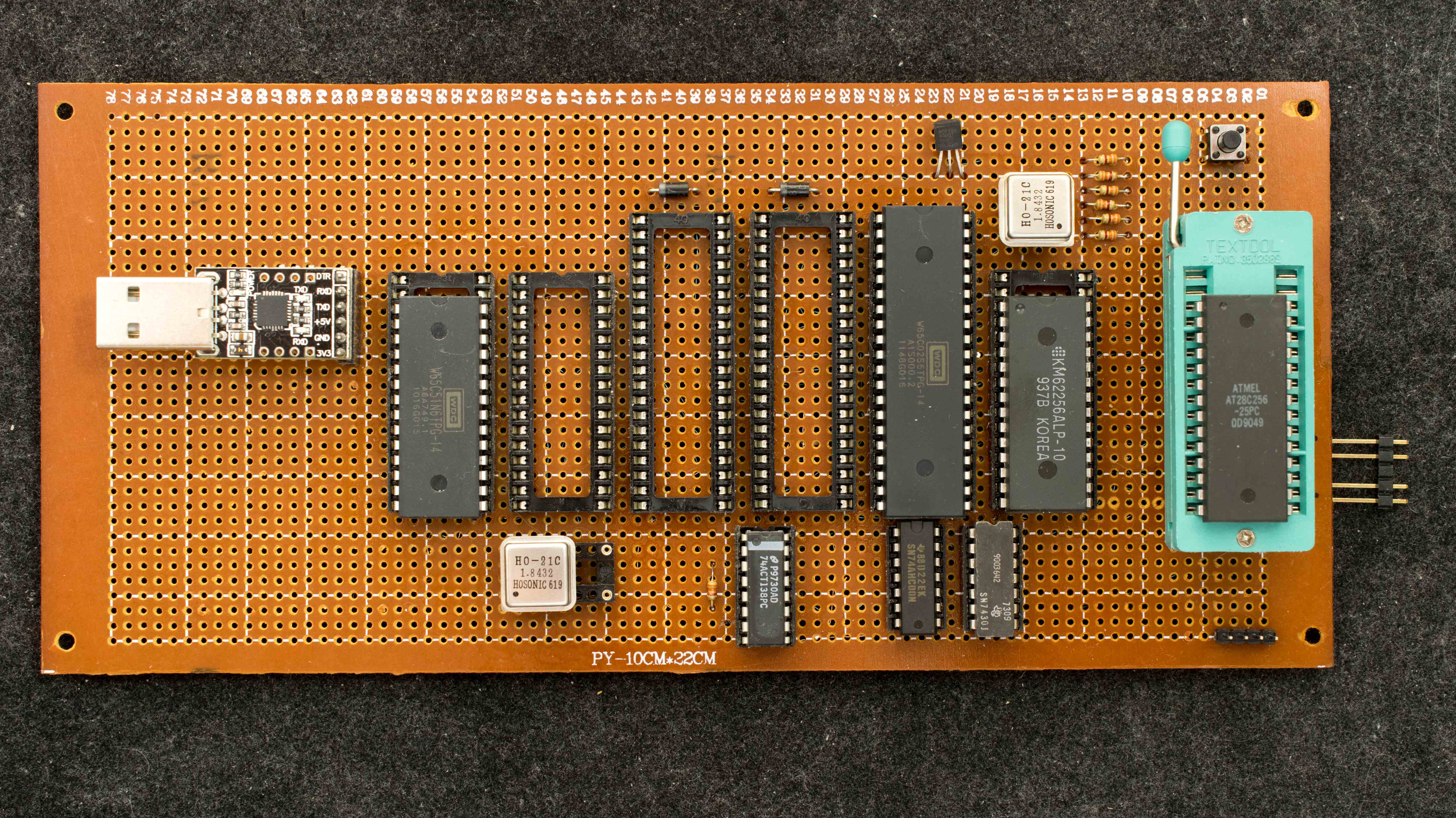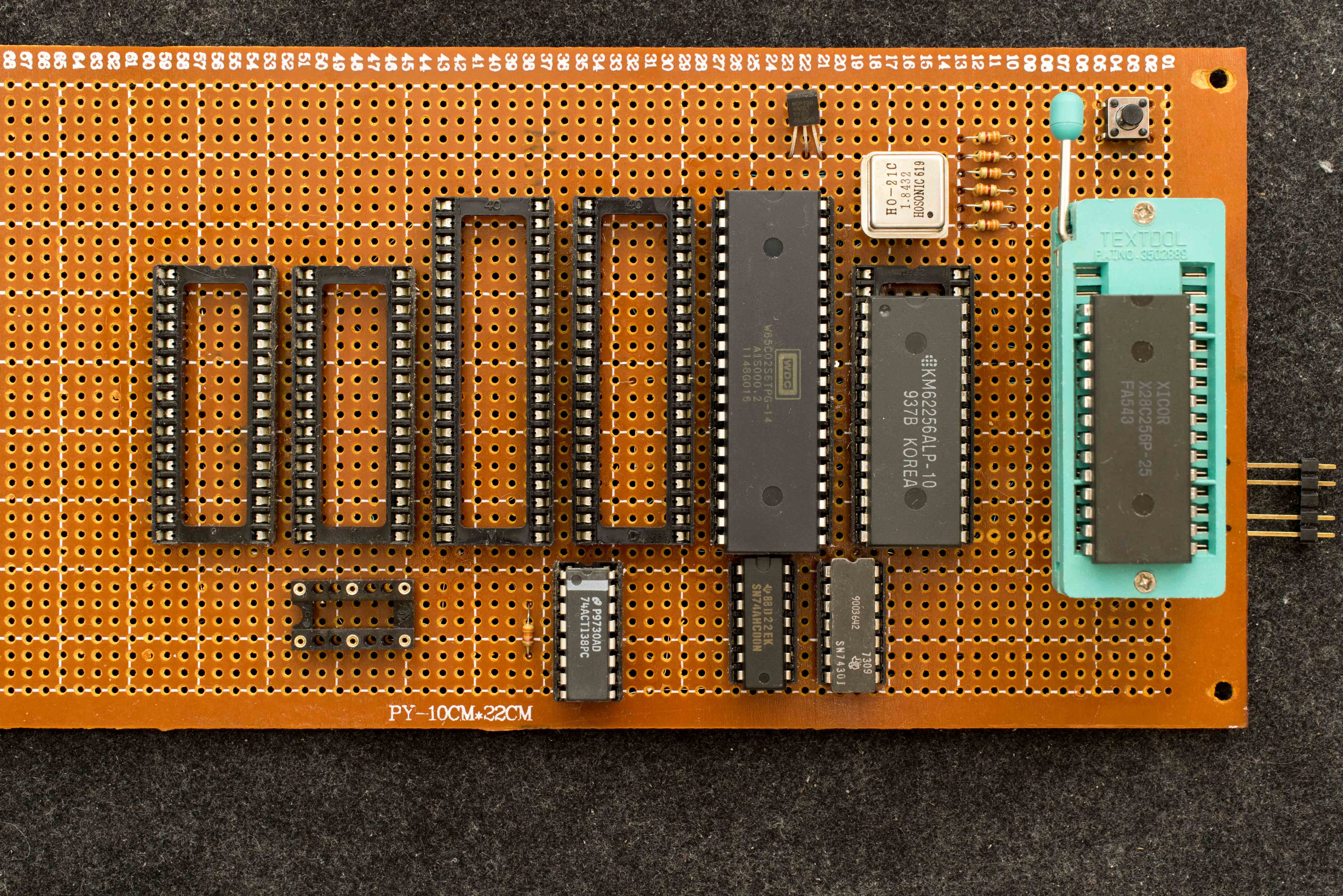The problem is intriguing and yesterday was a cold and dreary day so I built up a prototype board following your schematic and layout. The schematic is as amended on 10/22/22, as suggested by floobydust. The protoboard is also a single-sided vector board. Instead of wirewrapping (I don't have wire wrap sockets), I did point-to-point soldering which is slower than wirewrapping so I only did the CPU-RAM-ROM portion first. The parts I'm using are: