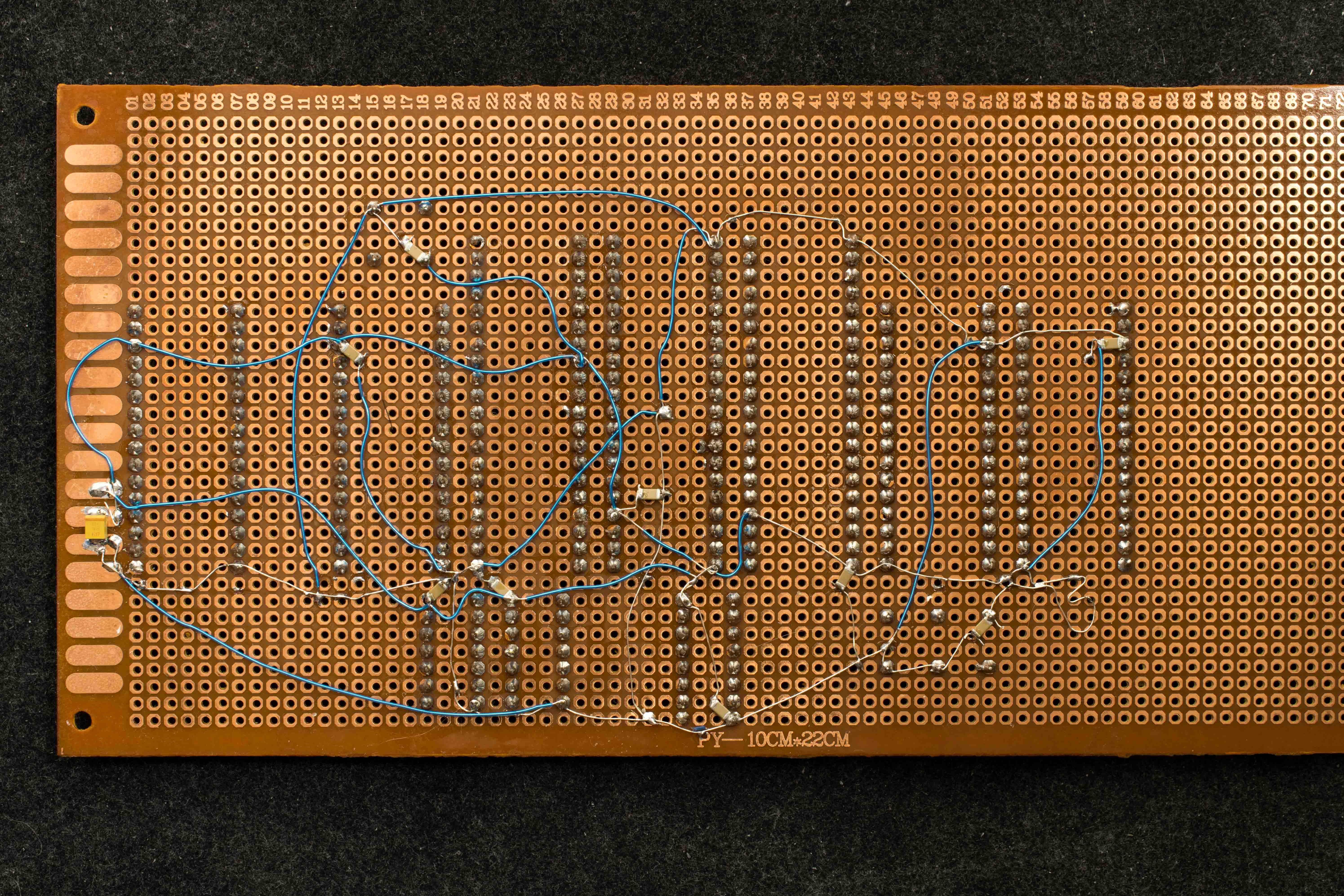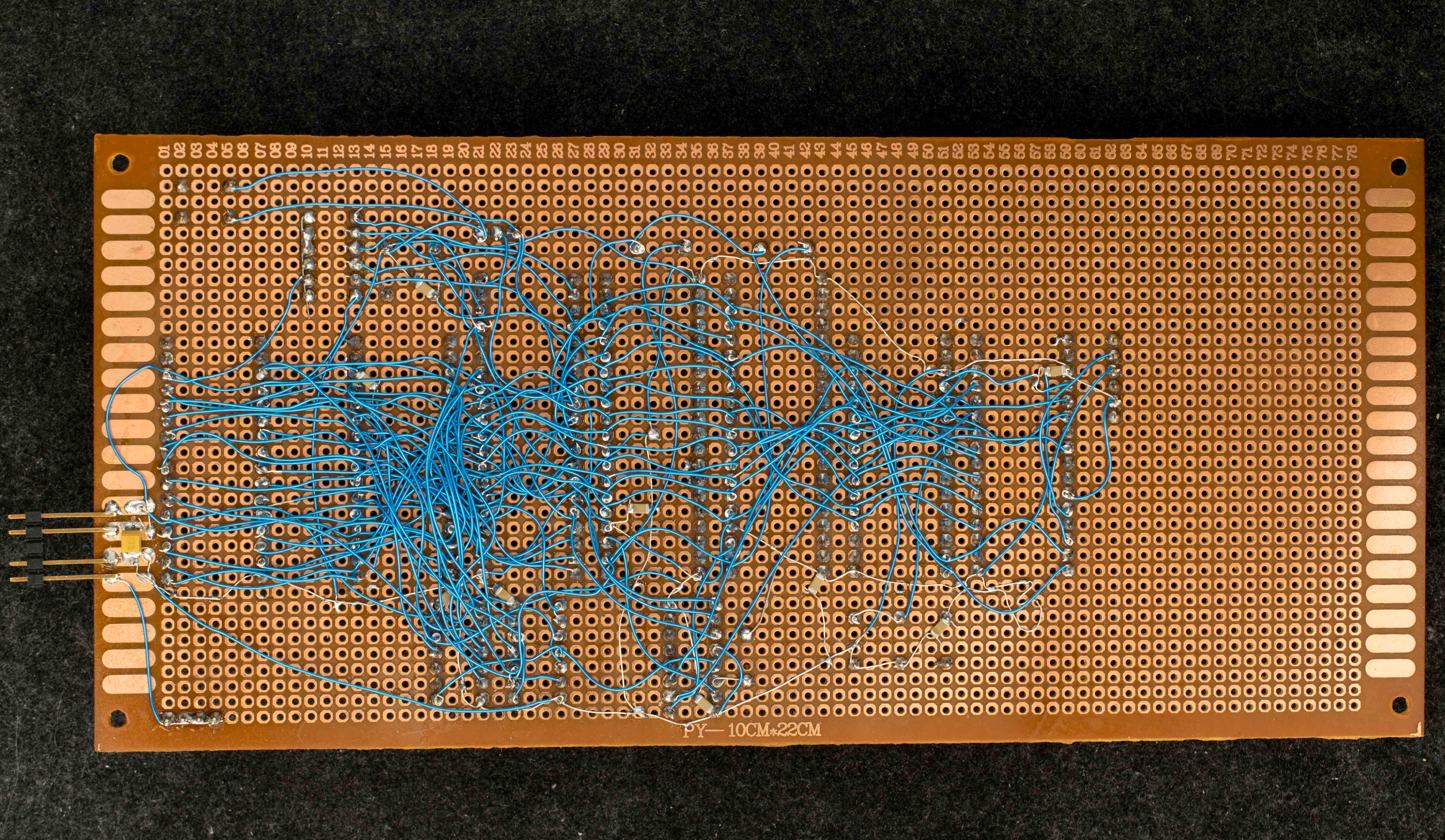 As for construction, build up the board and run a solid ground between all of the chips first, then add the 0.1 bypass caps to each chip, then connect a +5V power line to each chip. I'd also suggest taking a picture of this and posting it before going any further. Most of my early wire-wrap projects used some proto boards that had bus patterns which could be used for power distribution. I used them to to distribute the ground and +5V to each chip and ensured that I had a solid ground and voltage feed to every component that needed them before moving to the next stage of construction.