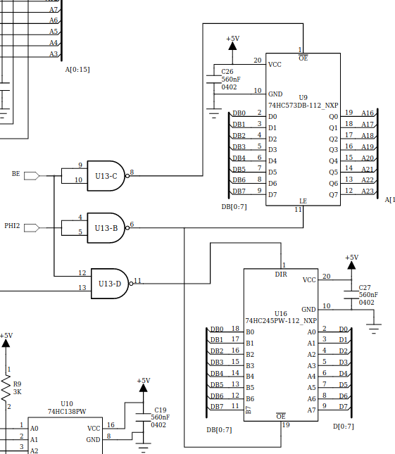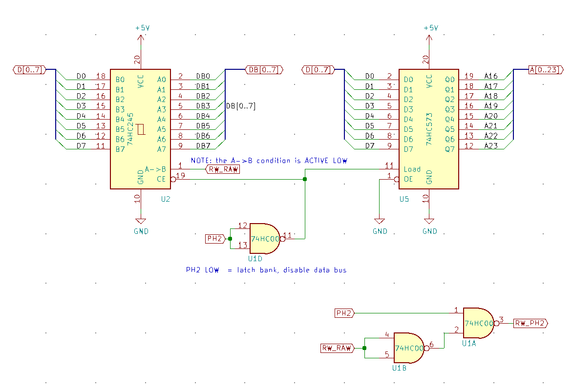 For the most part, I'm taking it right from the 65C816's datasheet, using a HC573 and HC245 to latch the bank address. One mistake I did make was to use two 74ALS00's instead of 74HC00's. I don't remember why I went with ALS chips, but I know now that the ALS->HC interface is incompatible and could be a source of the instability.