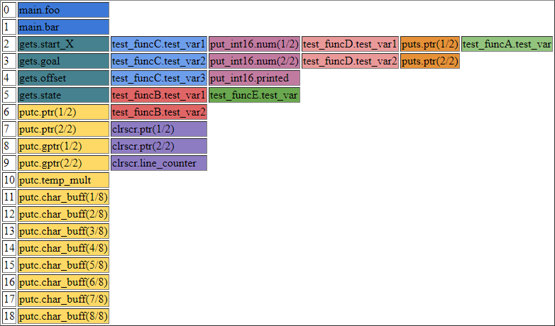 Non-local labels are considered possible functions and any subsequent variables assigned with LOCAL are in scope until the next non-local label, the same way local labels work. The script looks for JSRs to determine which functions call other functions to generate the call graph. The FUNC macro can optionally take a list of attributes to describe the function like "FUNC main, begin" which tells the scipt to begin the call graph with main. I'd like to add other attributes like "interrupt" and "re-entrant" since the memory for those needs to be handled differently. It should also be possible to detect re-entrant functions in the call graph and either generate an error if they aren't marked re-entrant or mark them automatically and handle them differently. Because it only looks for JSRs and not RTSs, it isn't a problem to embed a string after a JSR and use the return address to point to the data then return to the calling function with a calculated jump. Functions that can be reached with JMP (indirect) will also need to be labeled if they use LOCAL but should work too. It's not possible to tell at compile time what functions the indirect JMP might target to make sure they have all been labeled correctly, but I could output information about them and load that into my emulator to help debug.