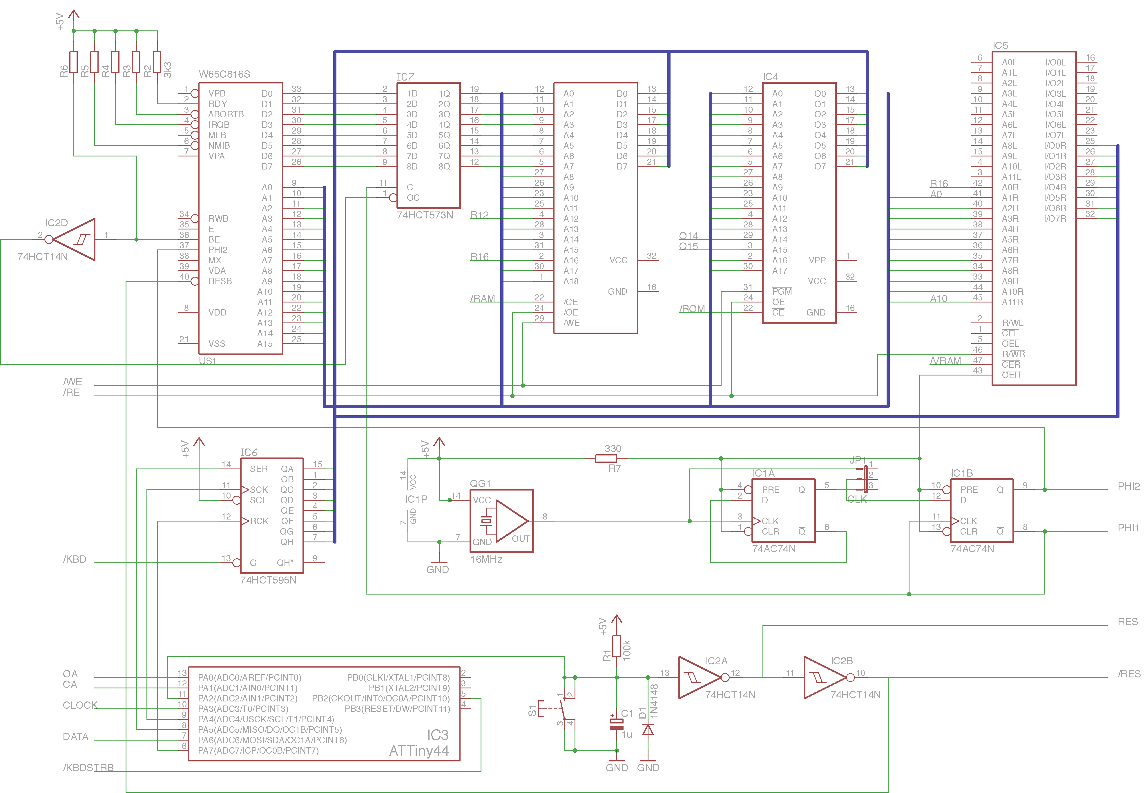 The two SC2691 (UART) are not drawn yet, but are not required to get an idea of my design. I use GALs instead of a CPLD (I have not yet jumped into this cold water) and as it is at the moment they are used very inefficiently. You could achieve the same result with just 3 GALs. This is mainly because I built the SBBC step by step before I had the final design and made many design changes during the soldering sessions. However it does have all the features I wanted it to have from the beginning. These were PS/2 Keyboard, VGA Display and a mode that emulates an Apple IIe. E.g. I never wanted to decode the full 16Mbyte address space (I need only 512kbyte RAM). Even better, instead of a real 16-bit IDE I use the CF-Cards in 8-bit IDE mode which made the interface a piece of cake.