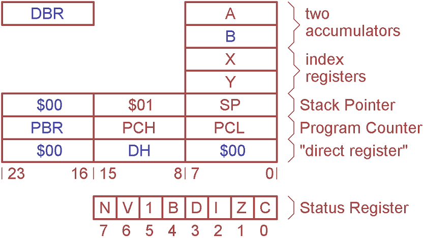 • The Direct Page register is 8 bits (called "DH") and points only to page boundaries. We can still have PHD and PLD push and pull 16 bits on the stack just for compatibility (with $00 as the low byte).
