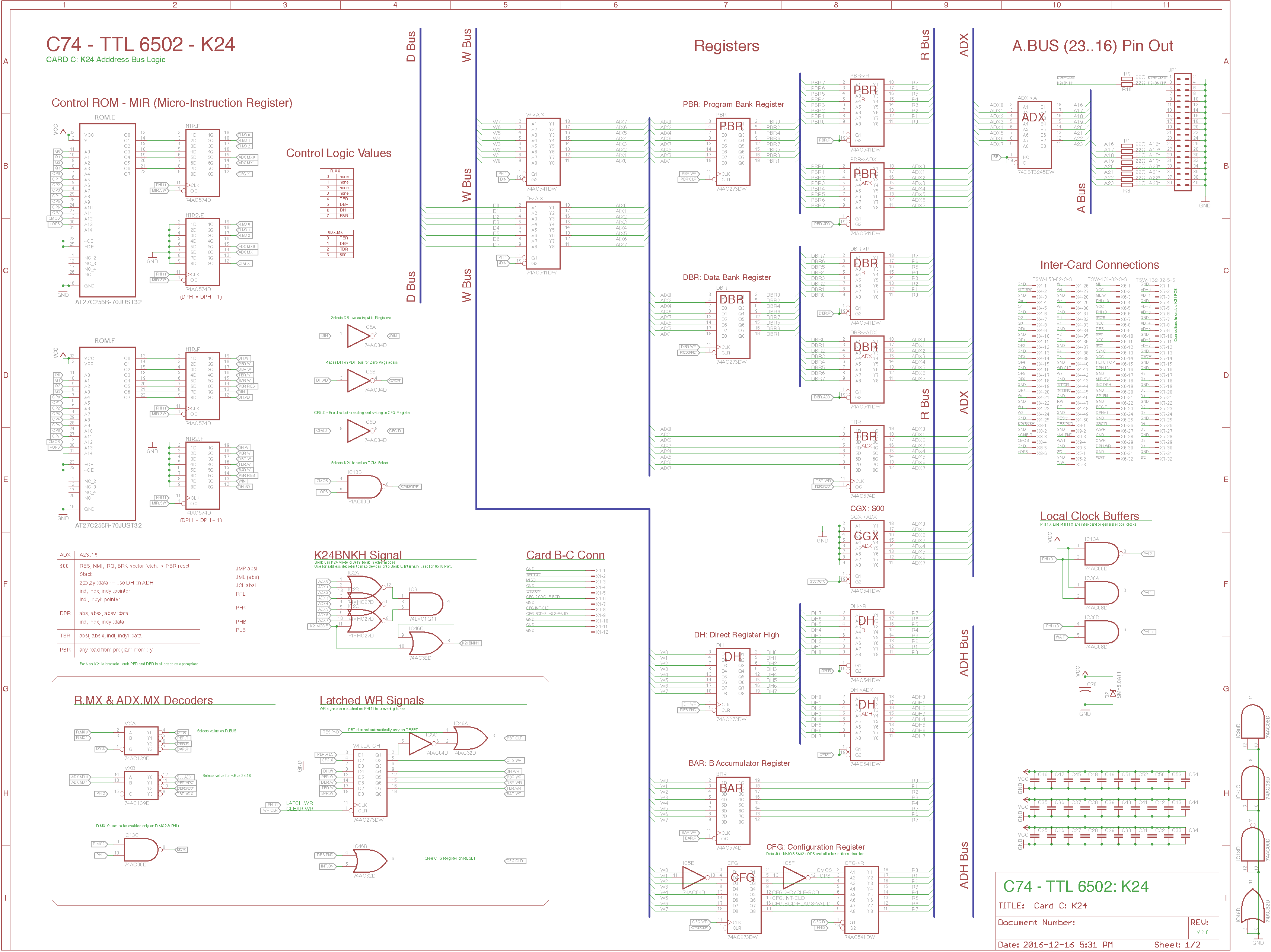 In the meantime, Dieter posted his Kludge24 (K24) addition, and it certainly looks interesting. Reading up a bit on the 65816, I can see how K24 provides for a reasonable implementation of Emulation Mode - supporting a 24 bit address bus, 8 bit registers and nearly all 65816 instructions. That’s exciting. I also clearly remember thinking about “partitions” on my C64 many years ago, and I was excited to see Dieter's version of just that above! A few mods and some microcode is all it would take to make K24 compatible with the existing TTL CPU. After kicking it around with Dieter a bit, I decided to get K24 done now while it’s all still fresh in my mind, and return to the thorny layout issues thereafter (good thing we're still not in a hurry :)).