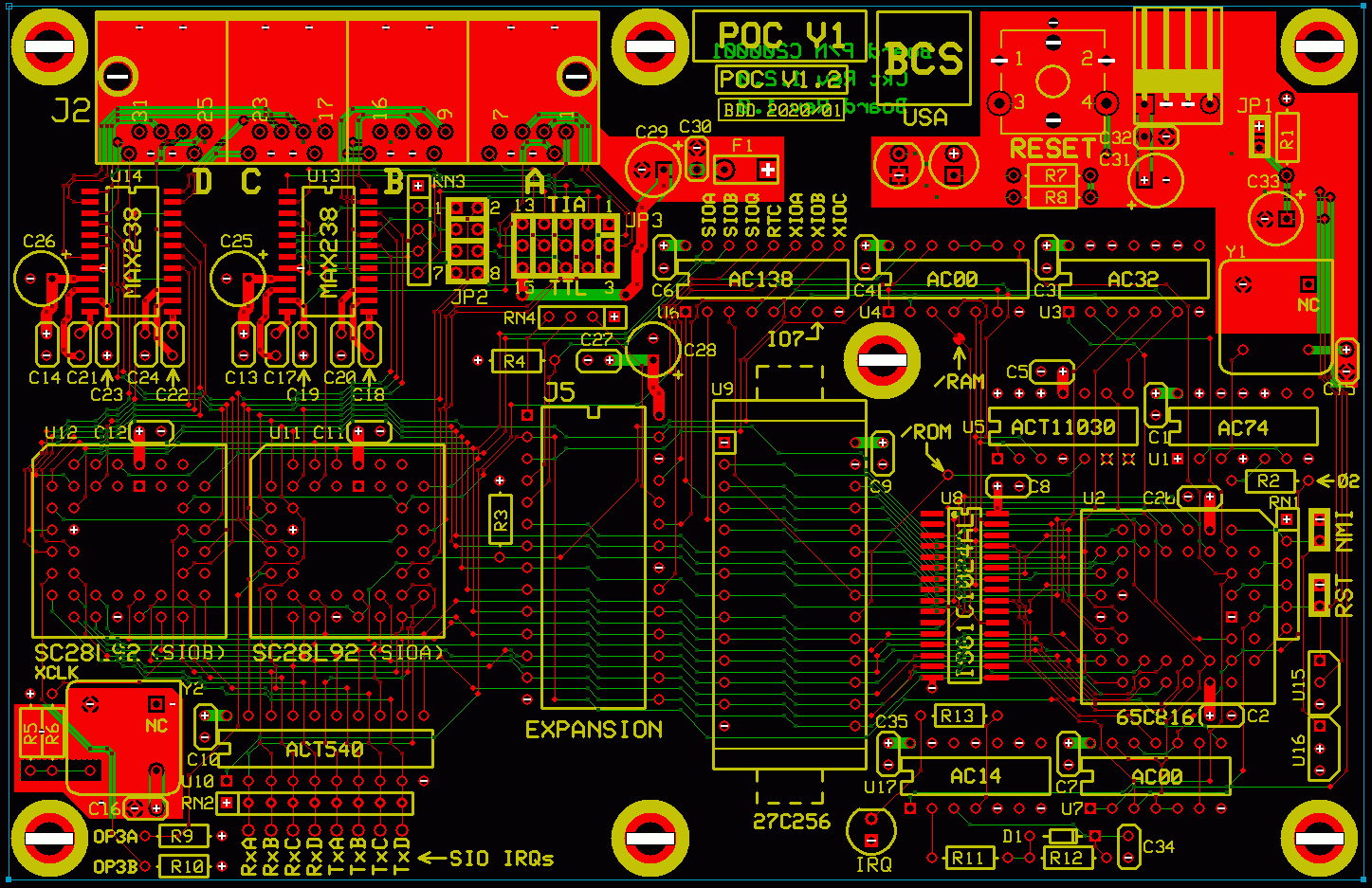 The main purpose of building V1.2 is to create a machine on which I can concoct a virtual QUART (vQUART, vQUART meaning "virtual quad UART") driver, as well as a BIOS API that is called with software interrupts instead of subroutine calls. As long as I have a reasonable amount of ROM and bank zero RAM available it will all work without the complication of extended addressing. Eliminating extended addressing means less glue logic will be required, which means fewer gates and hence more timing headroom. It also means I can use a smaller SRAM. Fewer gates means fewer chips on the board, which, as you will see, will allow me to use "vision-friendly" DIP packages for all logic devices (alas, the SRAM is only available in SMT, and space constraints require that I use the SOIC version of the MAX238 transceiver). Below is the schematic and PCB for this unit: