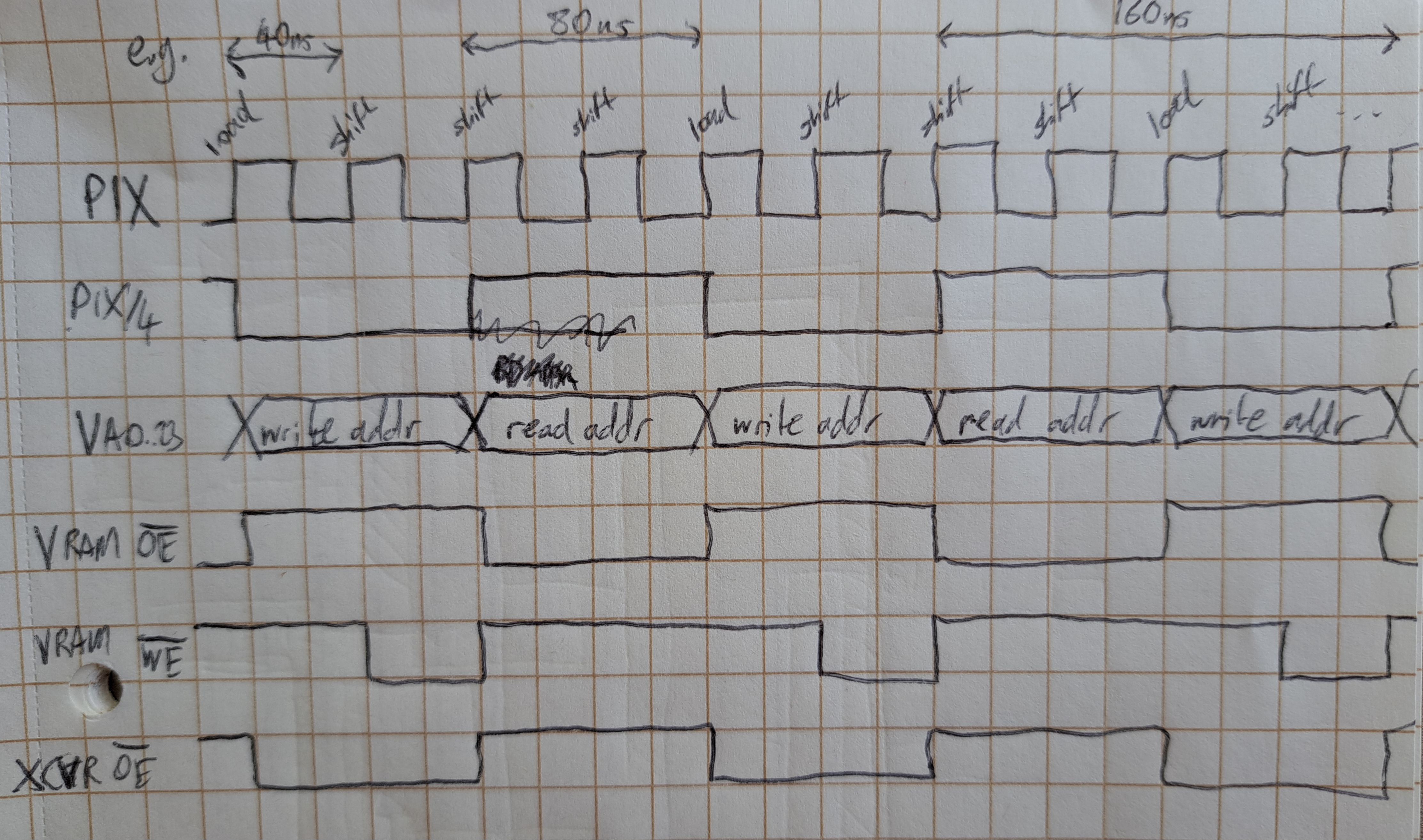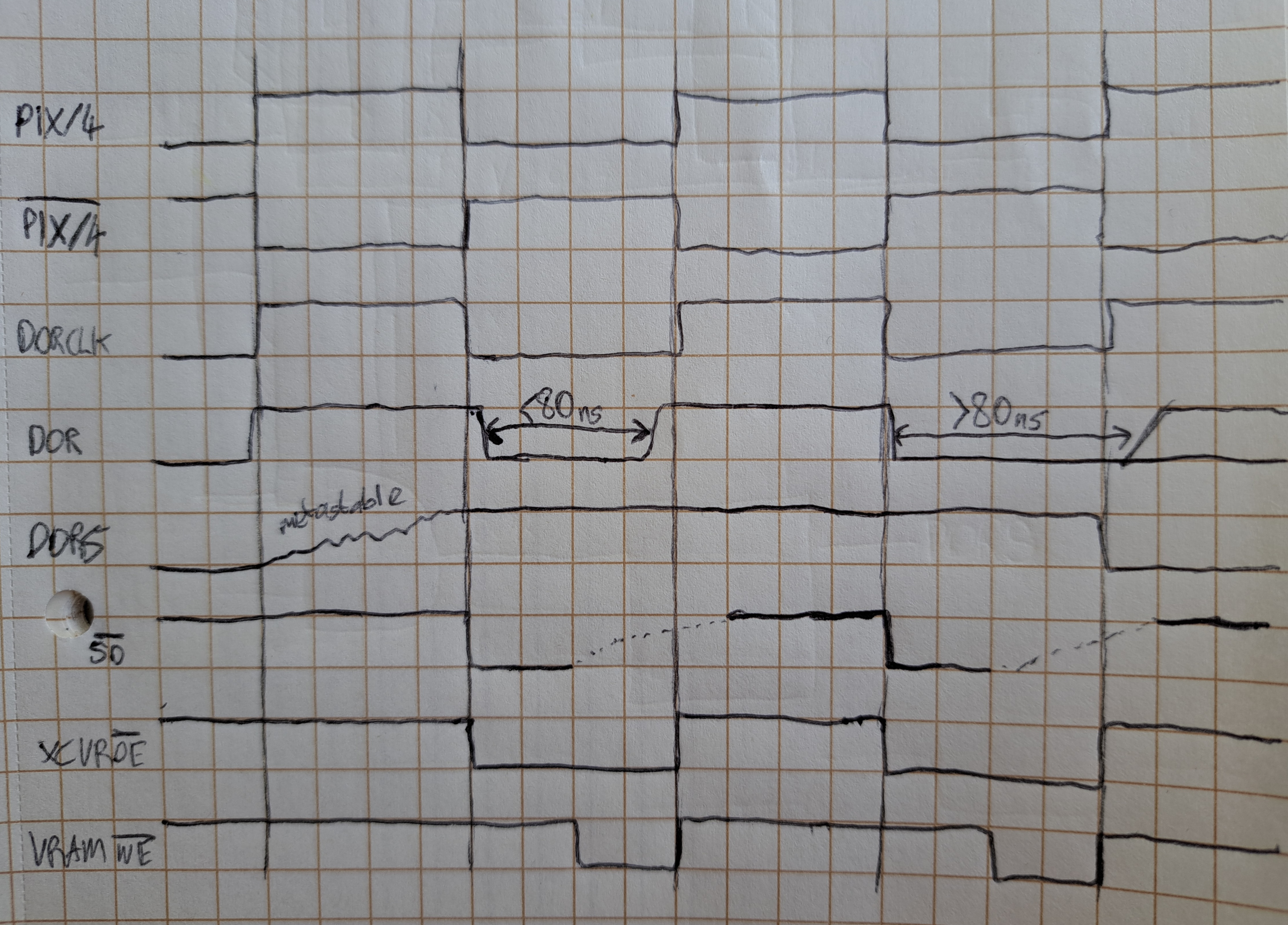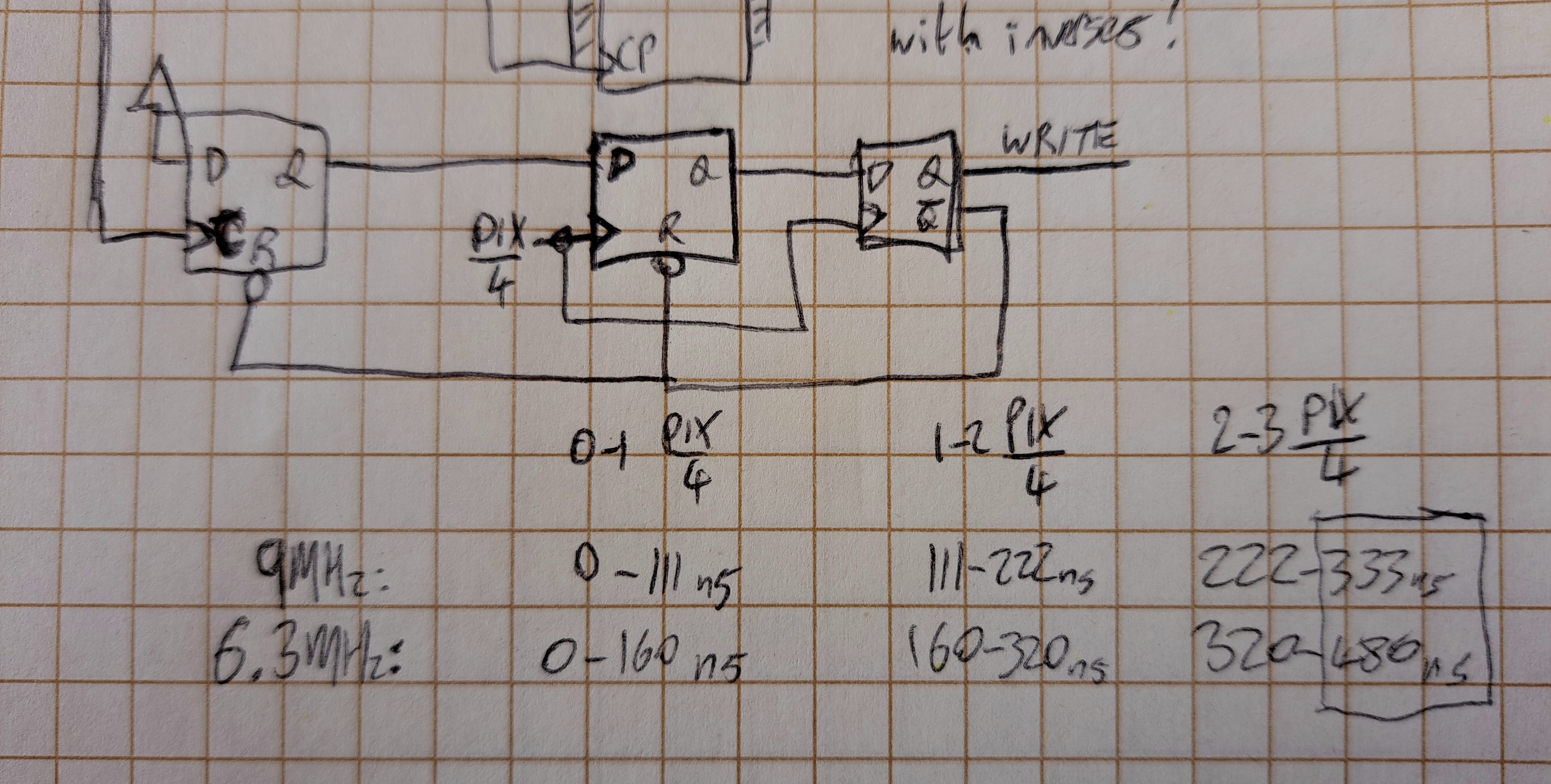 These signals are mostly just inverted or shifted versions of the PIX/4 clock signal, and they tend to require a bit of fine tuning to make the circuit stable, given propagation delays etc. The signals that are only active during write operations are also gated with some address decoding from the CPU side, and this decision is made in this diagram on the falling edge of PIX/4, just in time for the write cycle - this corresponds with PHI2 rising in my existing system.
