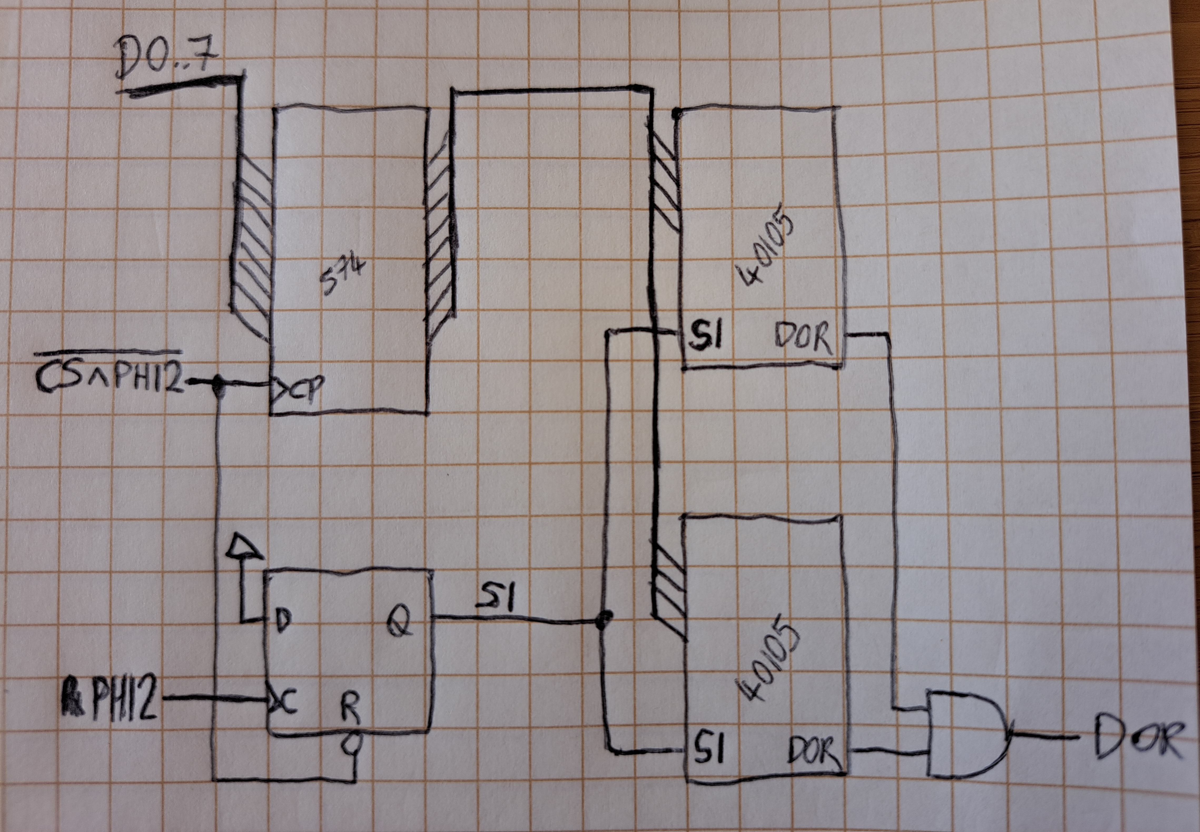For the asynchronous version, that decision needs to be based on whether the FIFO has data or not. The 40105 provides DOR ("data-out ready") that is driven high when data is available, and /SO ("shift-out") that causes the data to be removed from the FIFO on its falling edge. But I can't just use DOR directly to drive whether the write signals are active on a particular cycle, because its changes are not synchronised to the video clock - it could change at around the same time as the video clock and violate the setup or hold requirements of the filpflops. So it will be necessary to buffer it through a flipflop to guard a bit against metastability:
