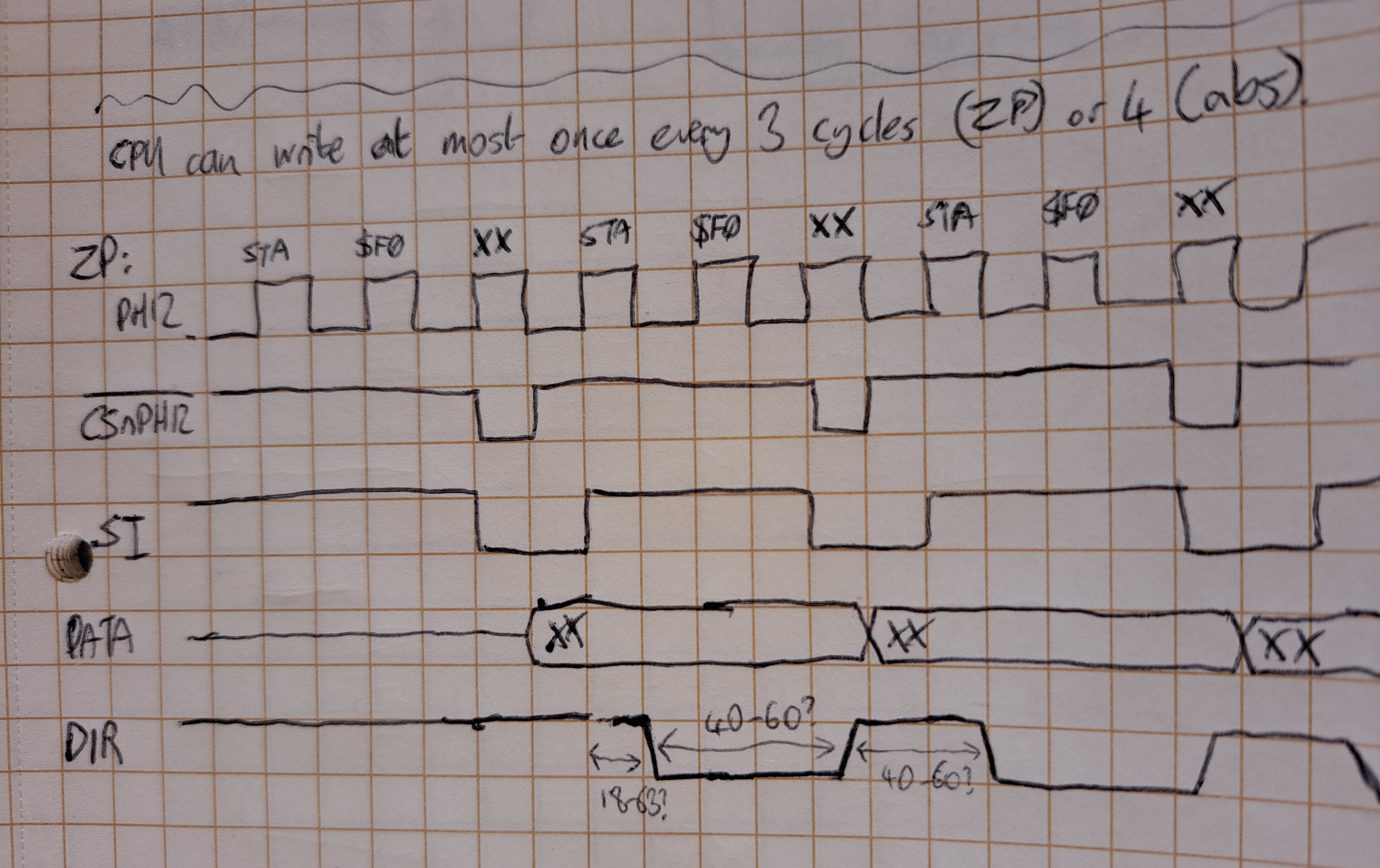 And here's a timing diagram I drew, based on the unlikely case that the I/O port is indeed in page zero and we're writing a continuous stream of constant data with an unrolled loop: