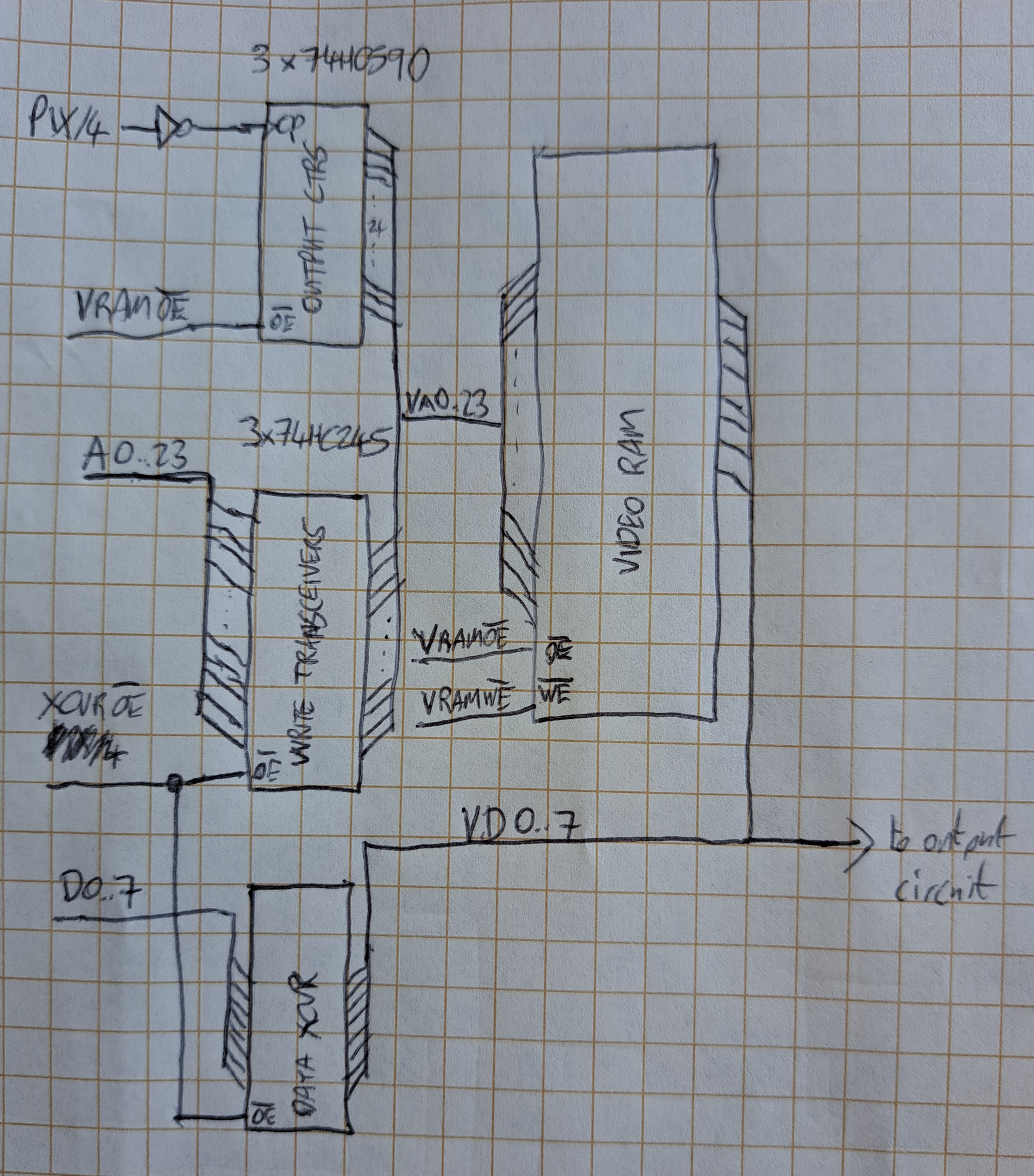 PIX is the pixel clock (e.g. 25.175MHz, or 36MHz for SVGA) and PIX/4 is that clock divided by four, as my system mostly processes four pixels at a time. As shown the video address bus is driven with read addresses half of the time, and the other half of the time it may contain write addresses - I didn't show it, but this only happens if a write is actually in progress. /VRAMOE allows the counters to output their address to the video address bus, and during write operations /XCVROE allows the transceivers to drive the video buses.