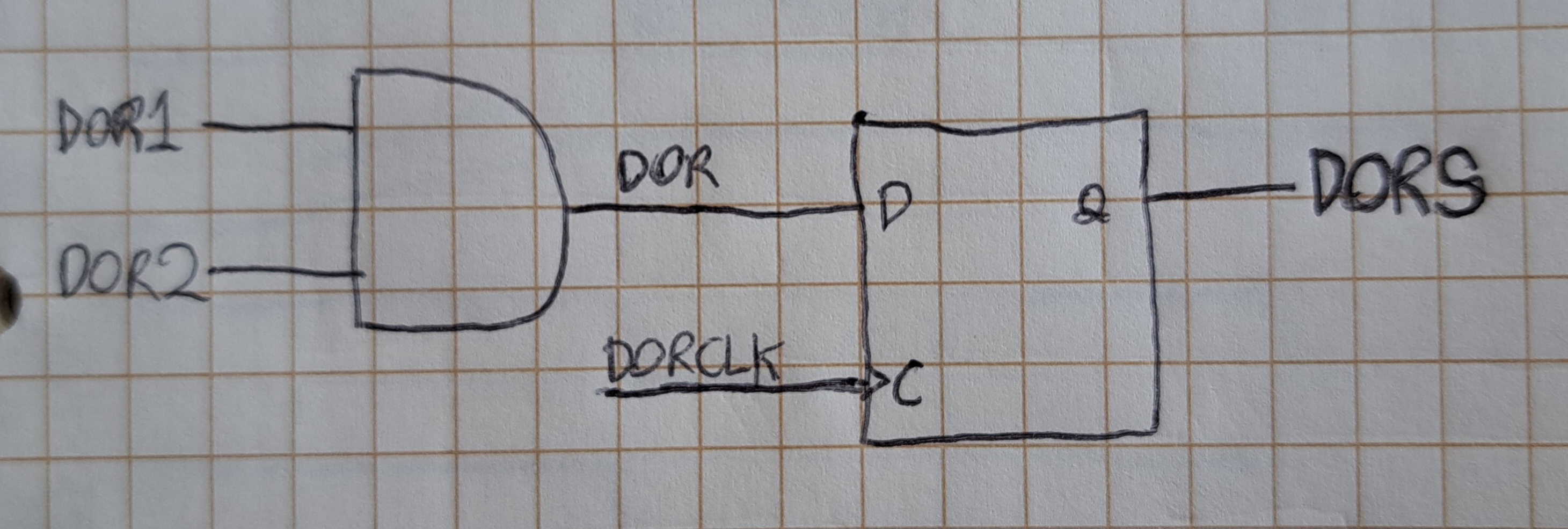 Here we AND together the DOR signals from two 4-bit FIFOs, so that we only react when both are ready, and gate it with a clock signal that needs to rise at an appropriate time. DORS is a "synchronised" version of DOR that can drive the rest of the circuit.