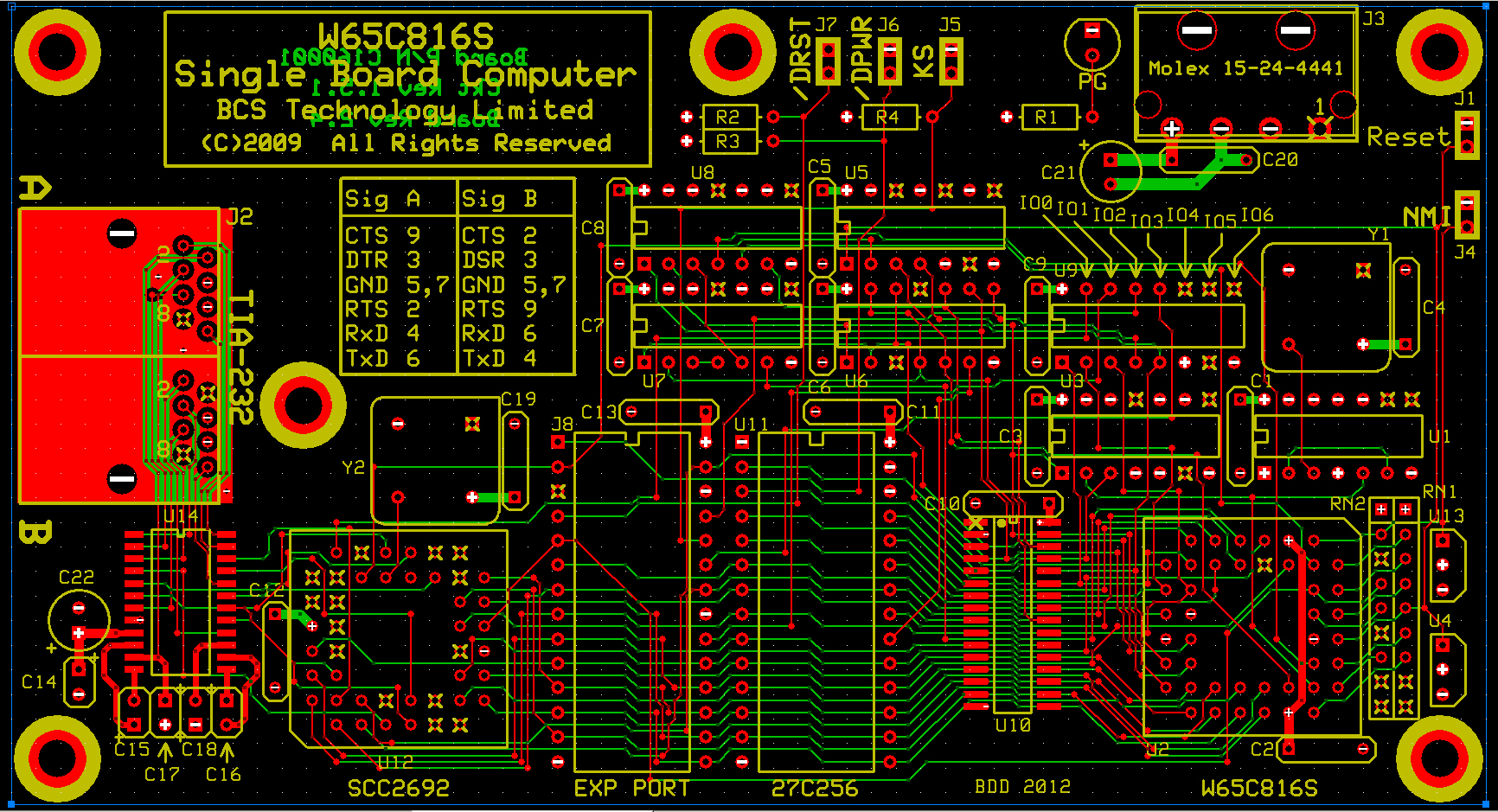 On the PCB, all patches have been incorporated into the new layout and the PDIP24 version of the MAX238 transceiver has been replaced with the SOIC-24 version (bottom left corner of the layout). I did this to allow me to shift the position of the TIA-232 dual jack assembly to get it away from a couple of protruding pins on the underside of the host adapter. There was a little trace rerouting in areas where some length reduction was possible, and I relocated the /RESET and /NMI inputs to the right hand side of the board for easier access. Board dimensions remain at 6 inches by 3.25 inches. Boards will be made using Express PCB's four-layer Proto-Pro service.