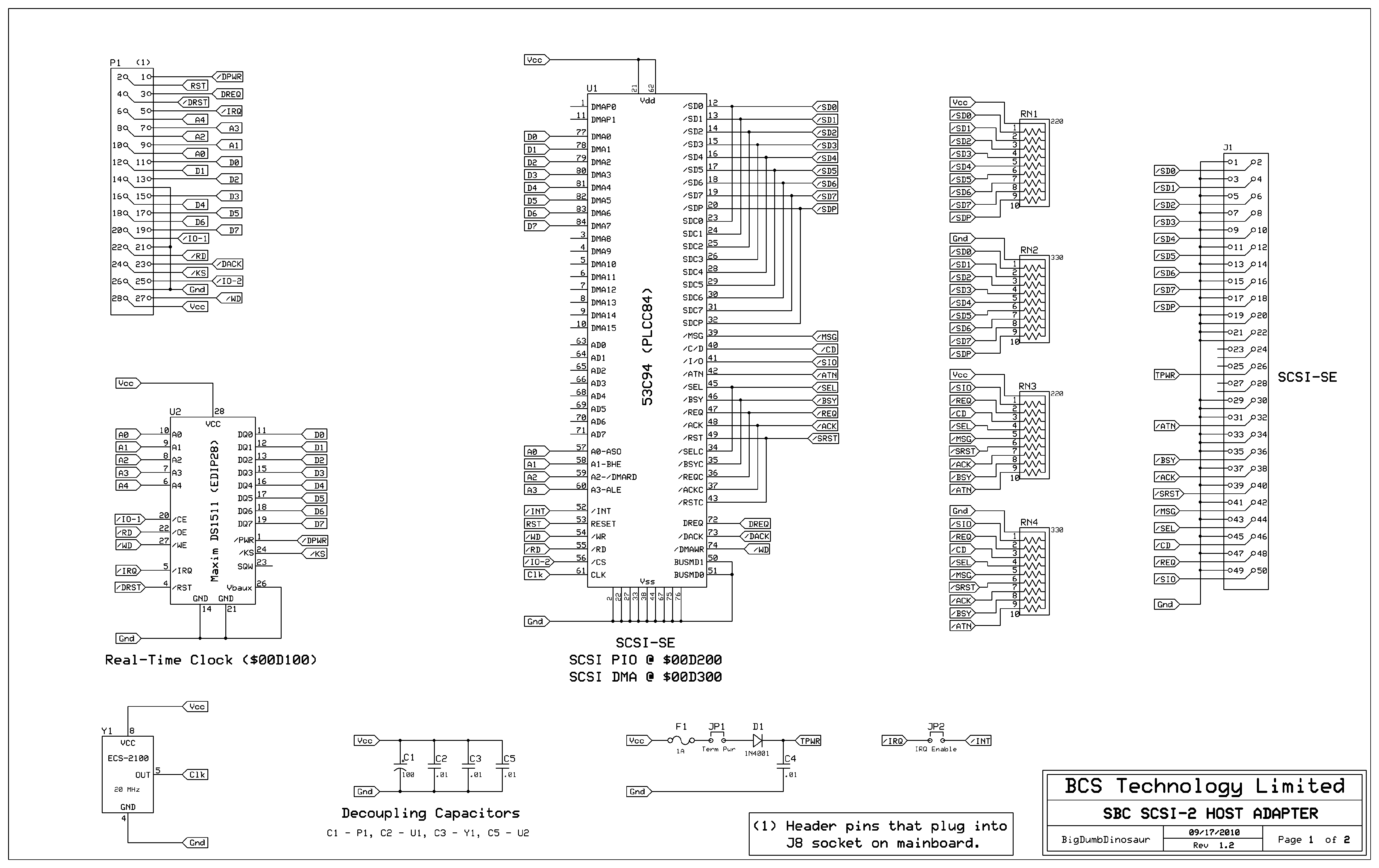 A significant change is that the watchdog timer socket (J8 on page 3, which is now designated as the "expansion port" on the printed circuit board layout) is wired so the SCSI host adapter can plug into it, or the watchdog can be plugged in and the POC run without the host adapter. I also connected the IO-3 output ($D300-$D3FF) from the 74AC138 decoder to an unused pin on J8, which allows me to access the 53C94's FIFO through the DMA port. FIFO DMA access, even without the benefit of a real DMA controller, substantially improves performance and was a goal from the onset when I designed the host adapter.
