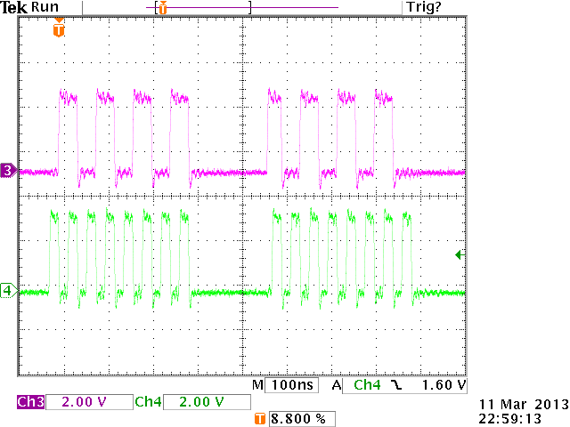 By the way, the SPI Flash configuration is based on Figure 2-12 from UG380, but I don't have the resistors to terminate the CCLK signal. It's just a straight connection (but less than 0.5 inch, so pretty short). Picture from scope shows the CCLK signal on the header pins next to the SPI flash, set to the highest speed it will go (26 MHz according to spec, but closer to 30 MHz on actual silicon). At this speed, configuration is near-instantaneous.