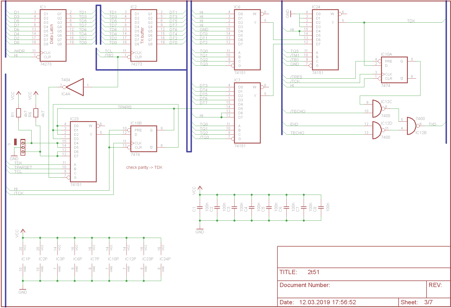 X51, experimental TTL implementation of a 6551, FAILED (that's why I had reversed the colors of the picture)