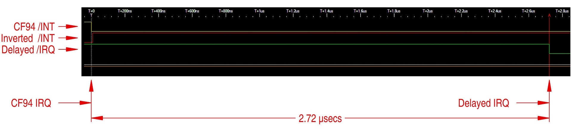 The delay isn’t as long as I had calculated when I was designing the host adapter because I made the assumption that two R-C time-constants would be required to “trip” the Schmitt inverter that drives the host adapter’s /IRQ output.  It appears only one time-constant is needed to do that.  Even so, the 2.72 µsec delay is more than sufficient to accomplish what is needed, even if the Ø2 clock rate is only 1 MHz (which it never is :D).