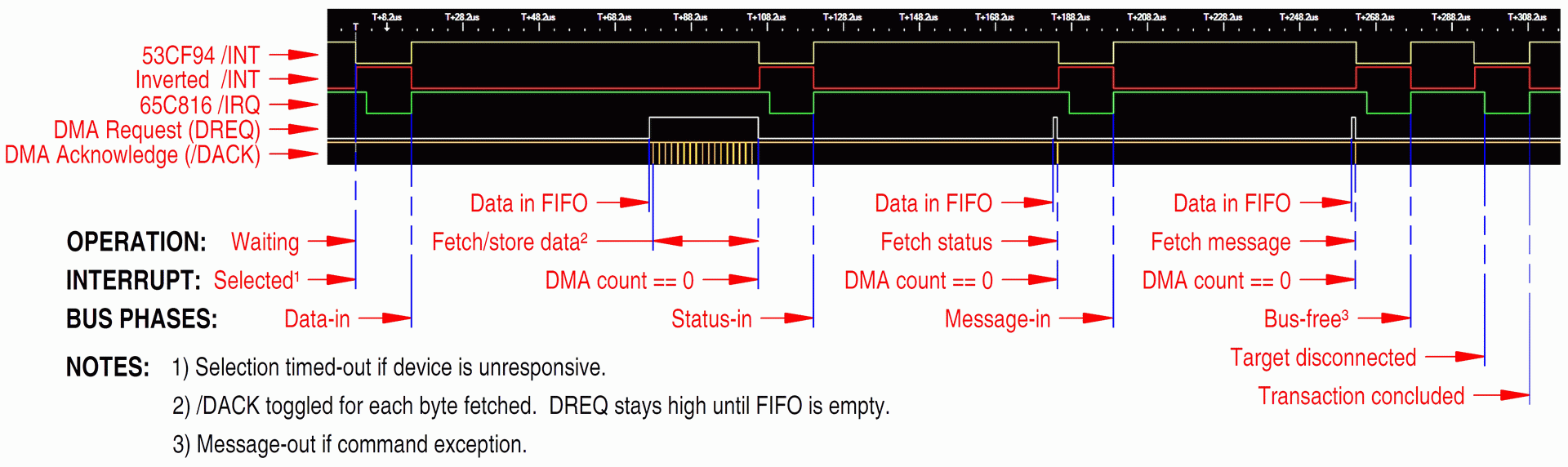 Although the above appears to be an infinite loop, it will be broken shortly after a write to C94_DMA if the write causes the target device to change the bus phase, or if the DMA transfer count reaches zero.¹  When the count hits zero, the C94 will interrupt and report a “DMA transfer completed” status.  In response, the SCSI portion of the interrupt service routine (ISR) will modify the address pushed to the stack by the 65C816 when it took the interrupt (using stack-relative addressing), which will result in the foreground part of the SCSI driver being redirected away from the transfer loop.