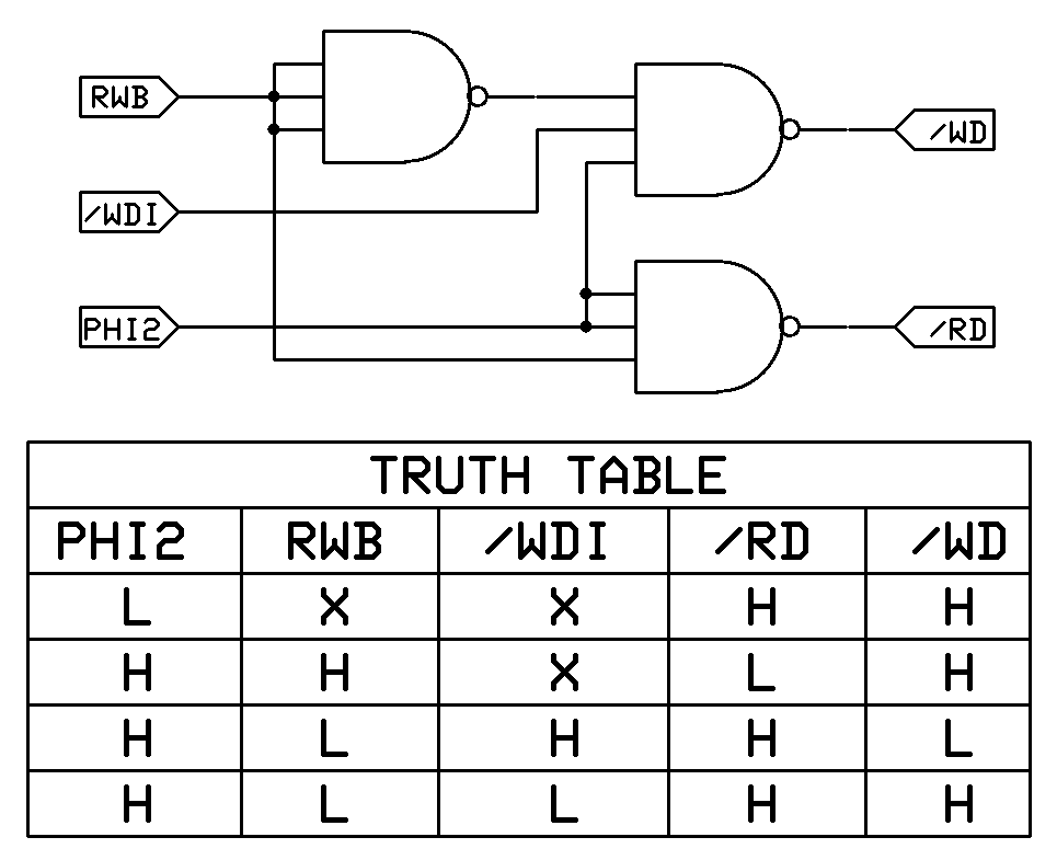 All well and good, but the discrete read/write logic that I have used in earlier POC permutations blindly assumes that when Ø2 is high, it’s okay to read or write.  Here is the discrete read/write circuit I have used in older POC units: