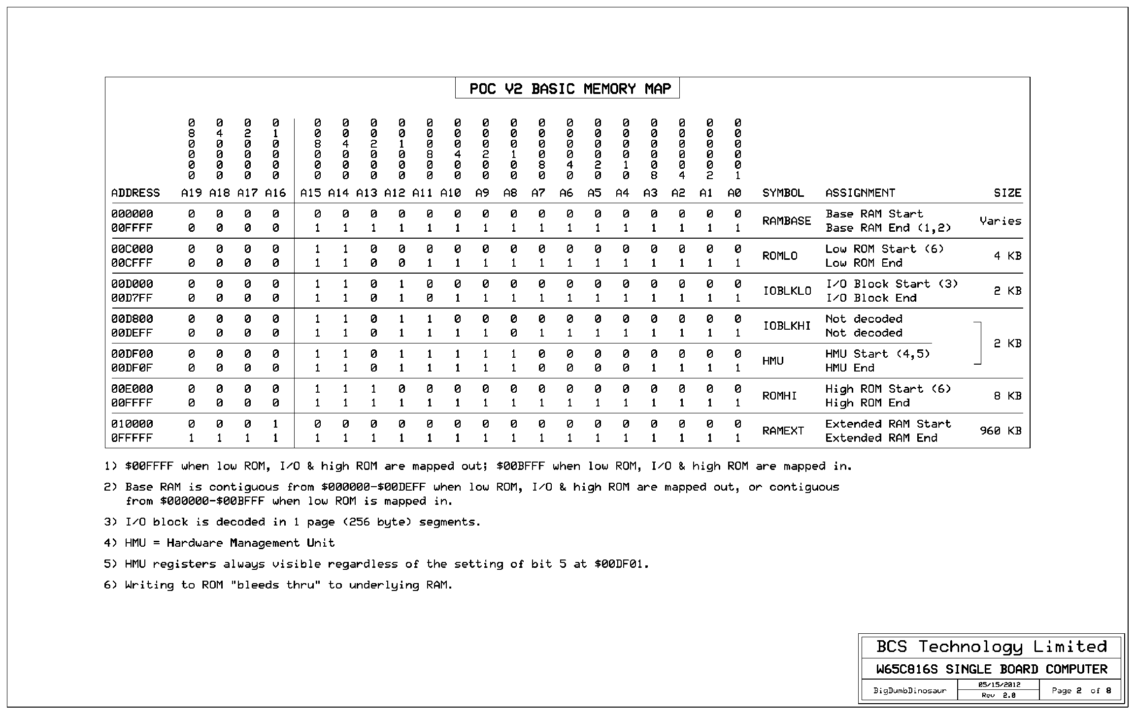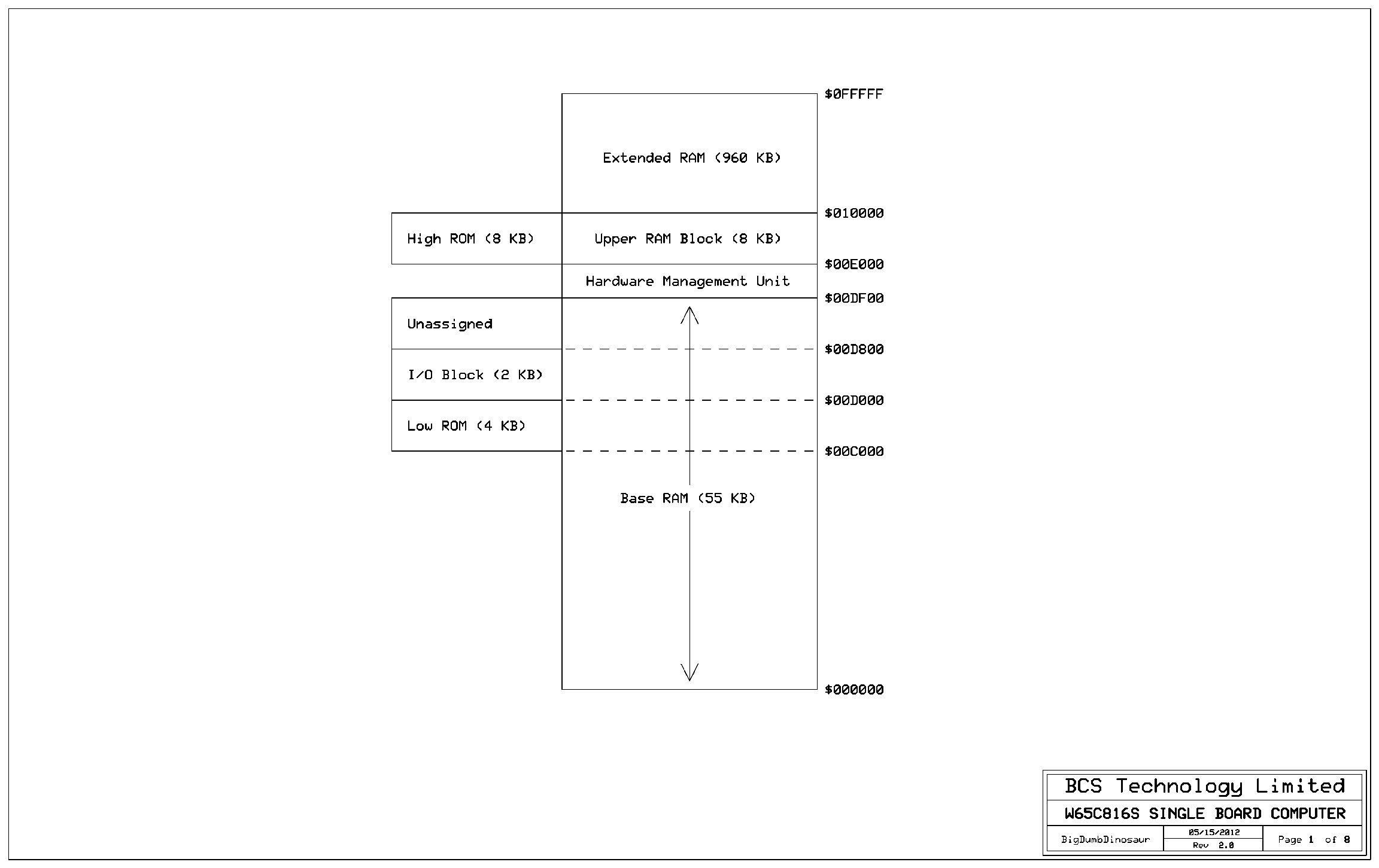 In POC V2, I'm not particularly concerned about RAM consumption at this time. Therefore, I've decided to use fixed sized protected space equal in size to a bank, or 64 KB. As the '816's architecture is bank-oriented, I'll use that term instead of page when talking about protected space. V2 will have 1024 KB of RAM, which is equal to 16 banks, enough to prove that my virtual addressing concept will work—or not. :? The CPLD will be tasked with generating the A16-A23 bank bits, which means it will always determine into which bank an access will occur. If my logic is correctly implemented, accesses that would normally be forced into bank $00 by the MPU could instead be directed to a different bank without the running process being aware of the change. The result would be a solution to the bank $00 dilemma.