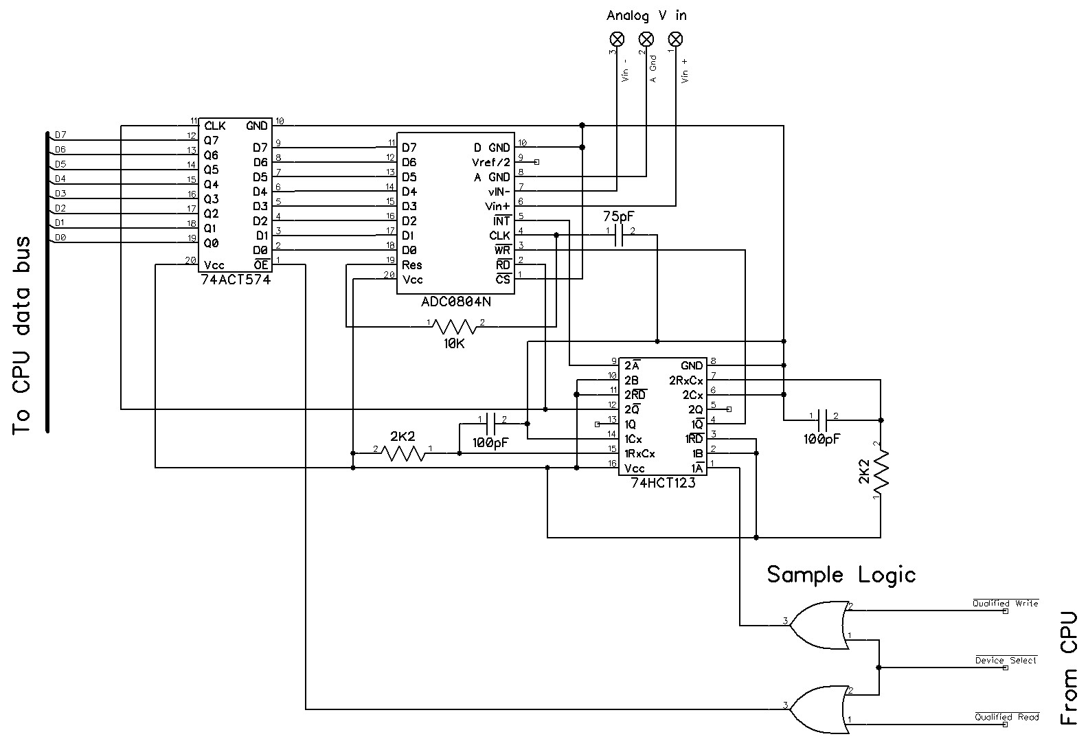 The whole thing takes a maximum of 120us, so you must wait that length of time between initiating the conversion and reading the 74AC574. Since the entire activity is asynchronous from the CPU's perspective, this solution should work on any system that produces a write pulse long enough to be recognized by the 74HCT123. Which is typically about 2.5ns (17ns max) at 24C.