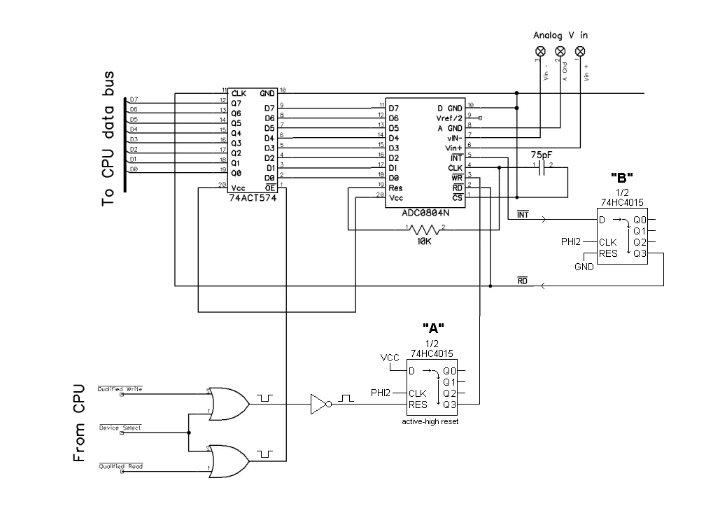 There are some details I didn't bother to figure out; for example, the upper limit re the CPU bus clock. But the ADC will see /RD and /WR pulses that are over three PHI2 clocks in duration, which is favorable. What would provide even longer pulses is if the shift registers were clocked at a rate lower than PHI2. Maybe the clock generated by the ADC0804N would be suitable.