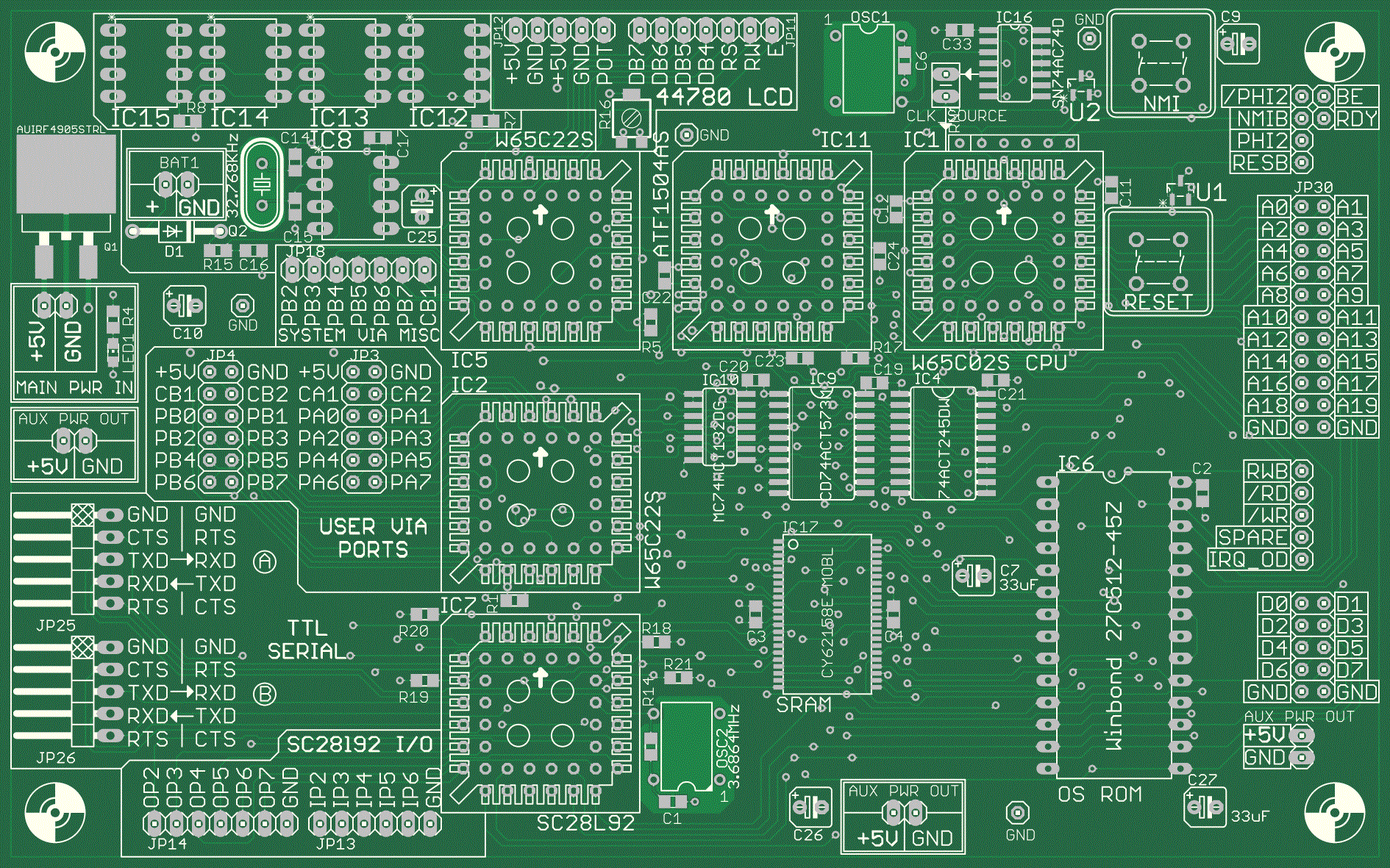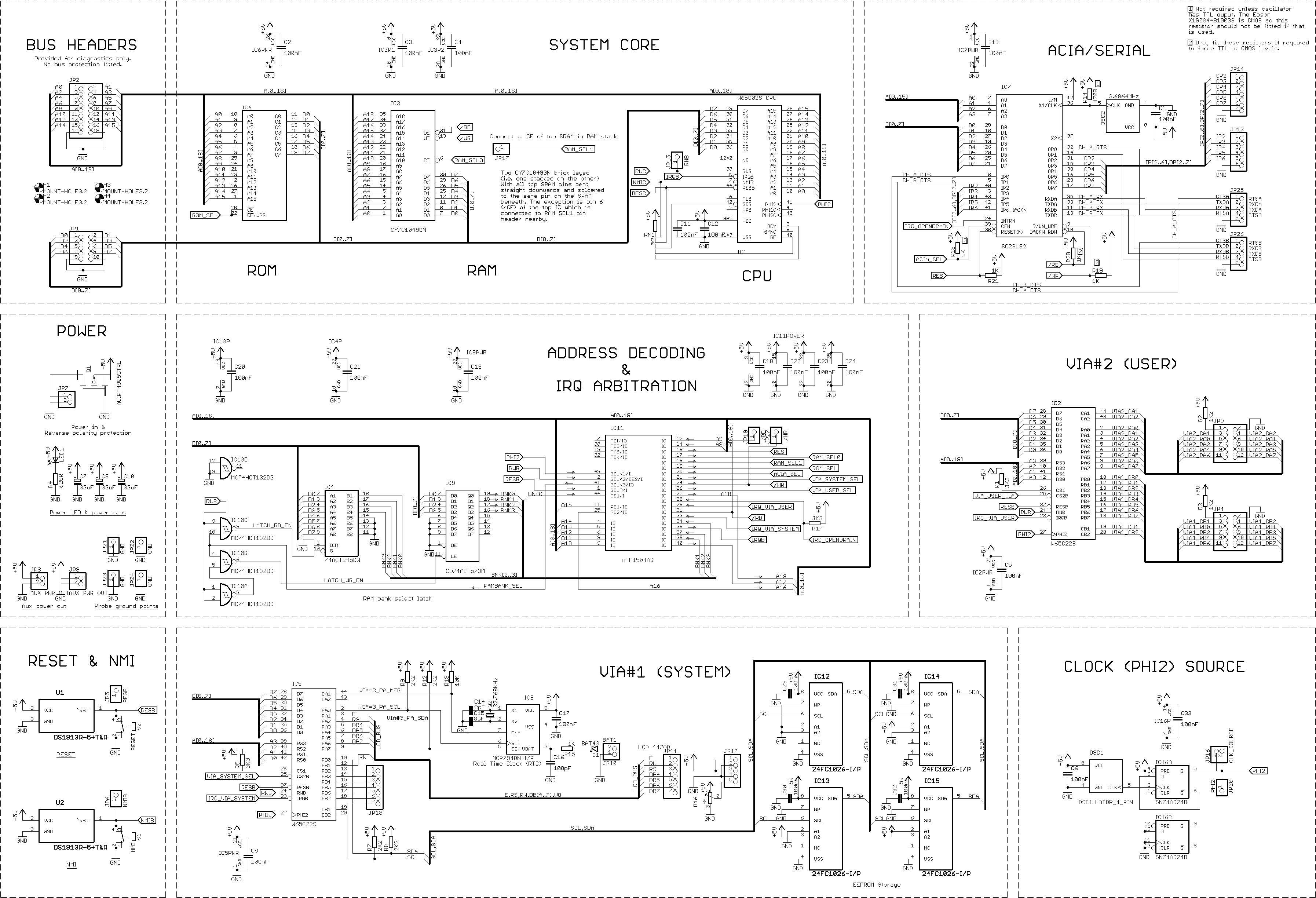 System VIA: This is for the OS to use. It gives access to a pin header for 44780 LCD (in 4 bit mode), 4 banks of 128KLB I2C EEPROM and a real time clock (RTC).