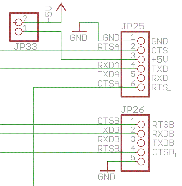 The serial channels map to 2 headers which provide for TXD, RXD, CTS, RTS and GND, don't use a line driving IC but utilise TTL levels. A TTL to RS232 module map be used with this.