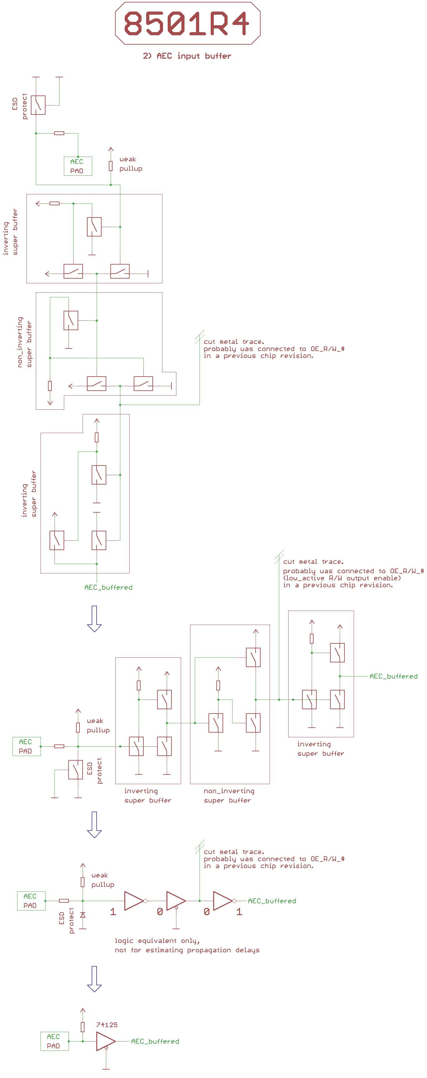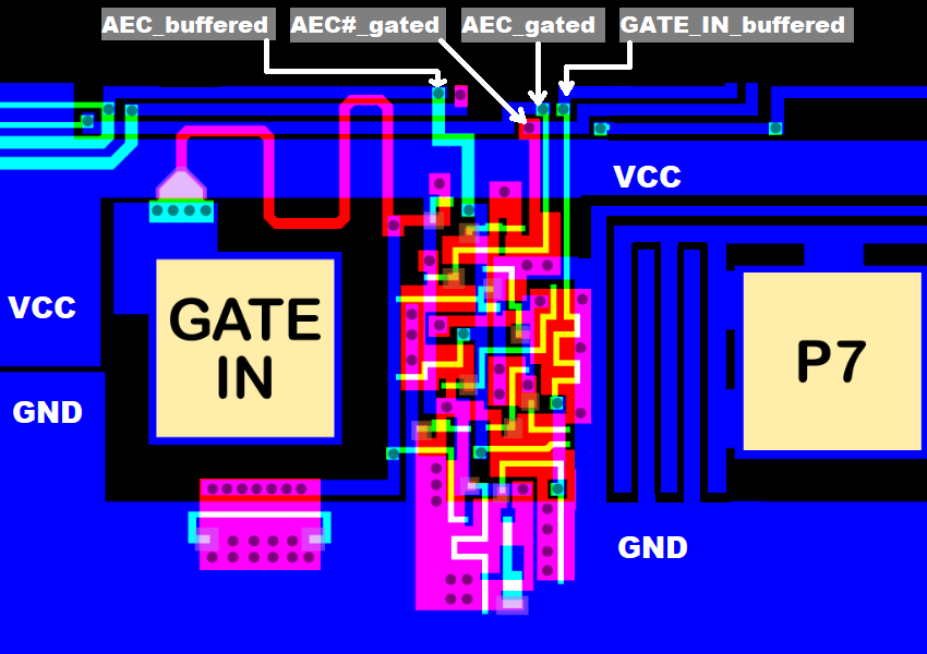 Note the cut metal trace from AEC#_buffered to the R/W# pad driver output enable...