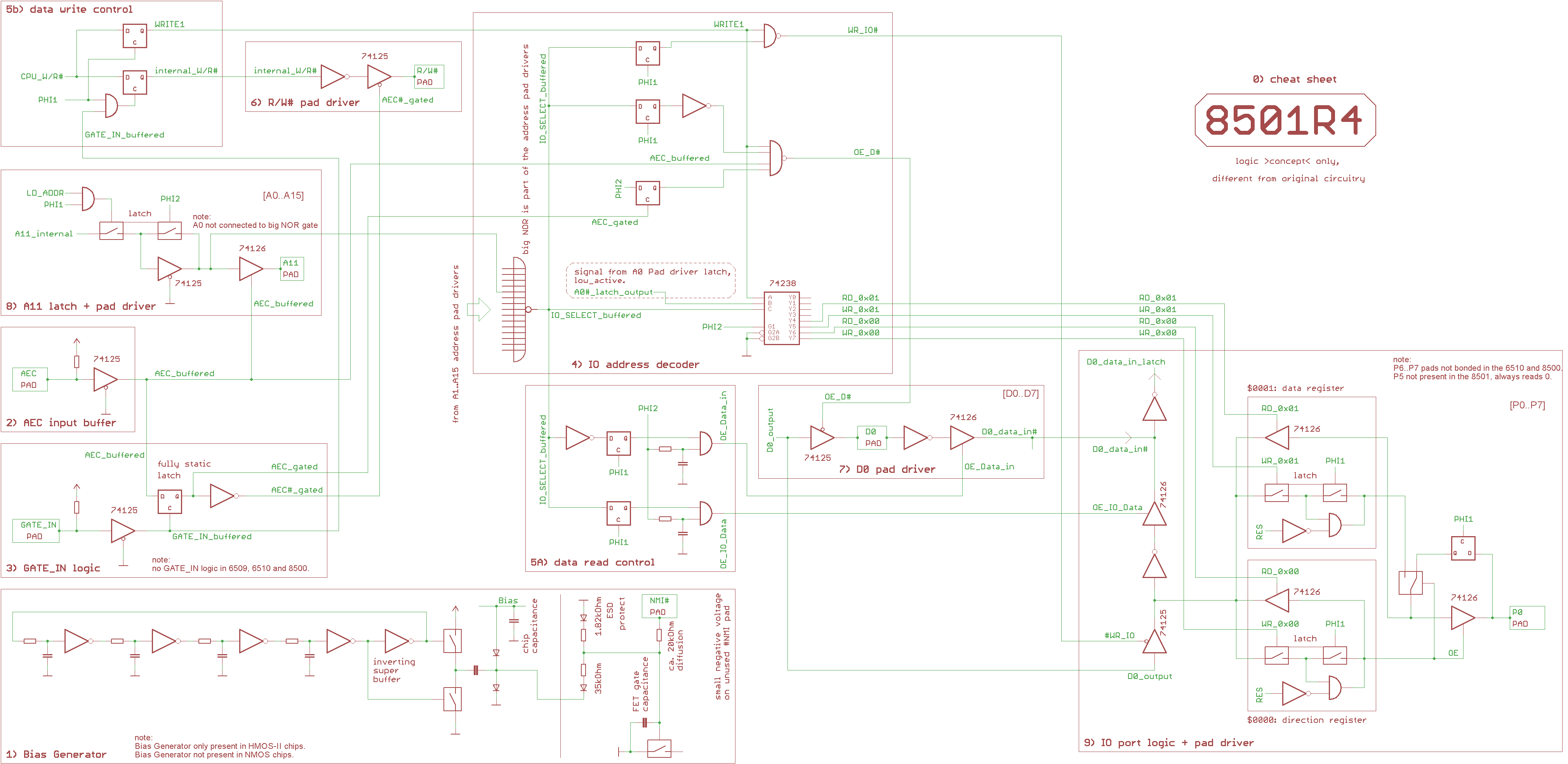A picture of the 8501 silicon, with the interesting areas marked according to the cheat sheet.