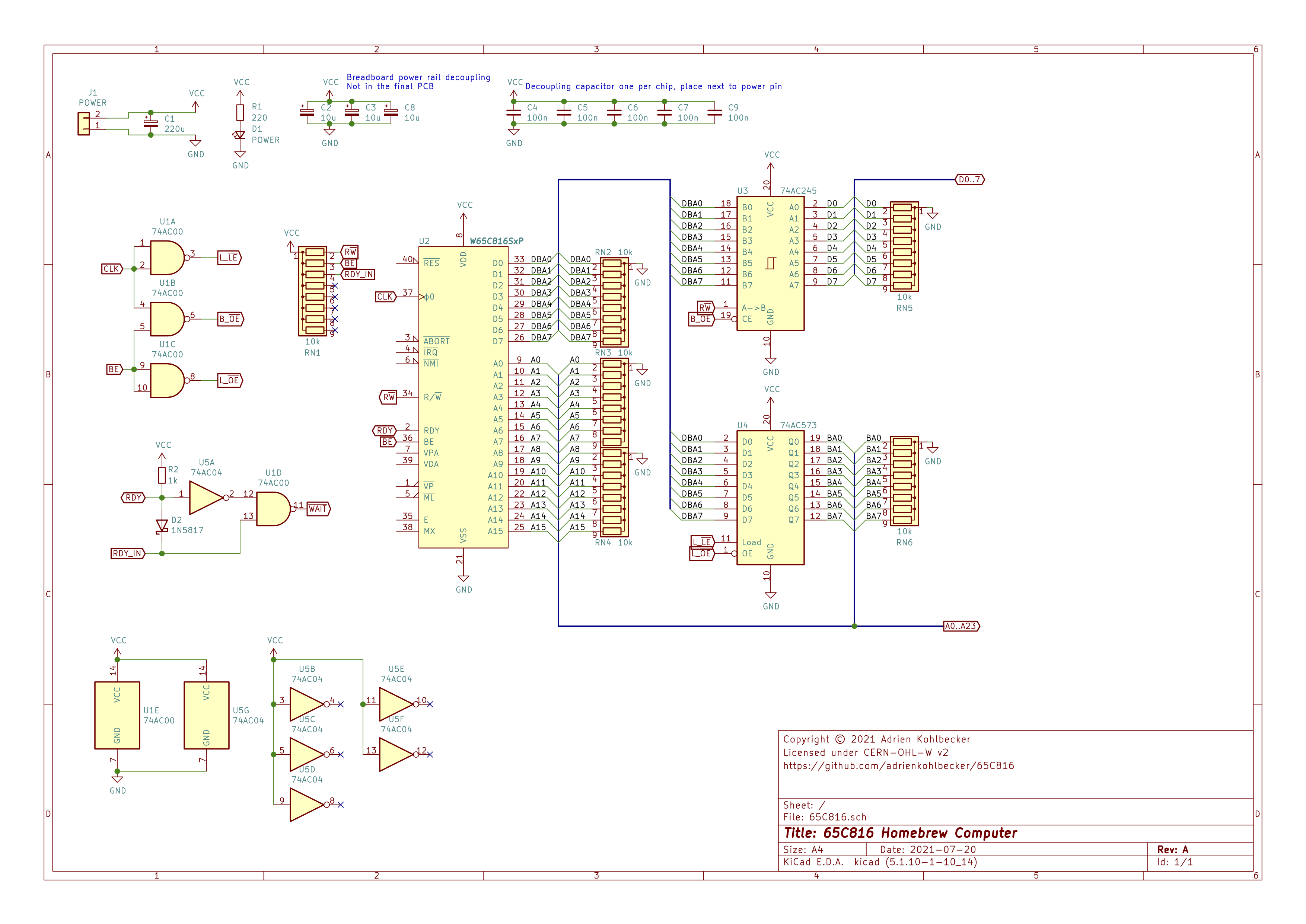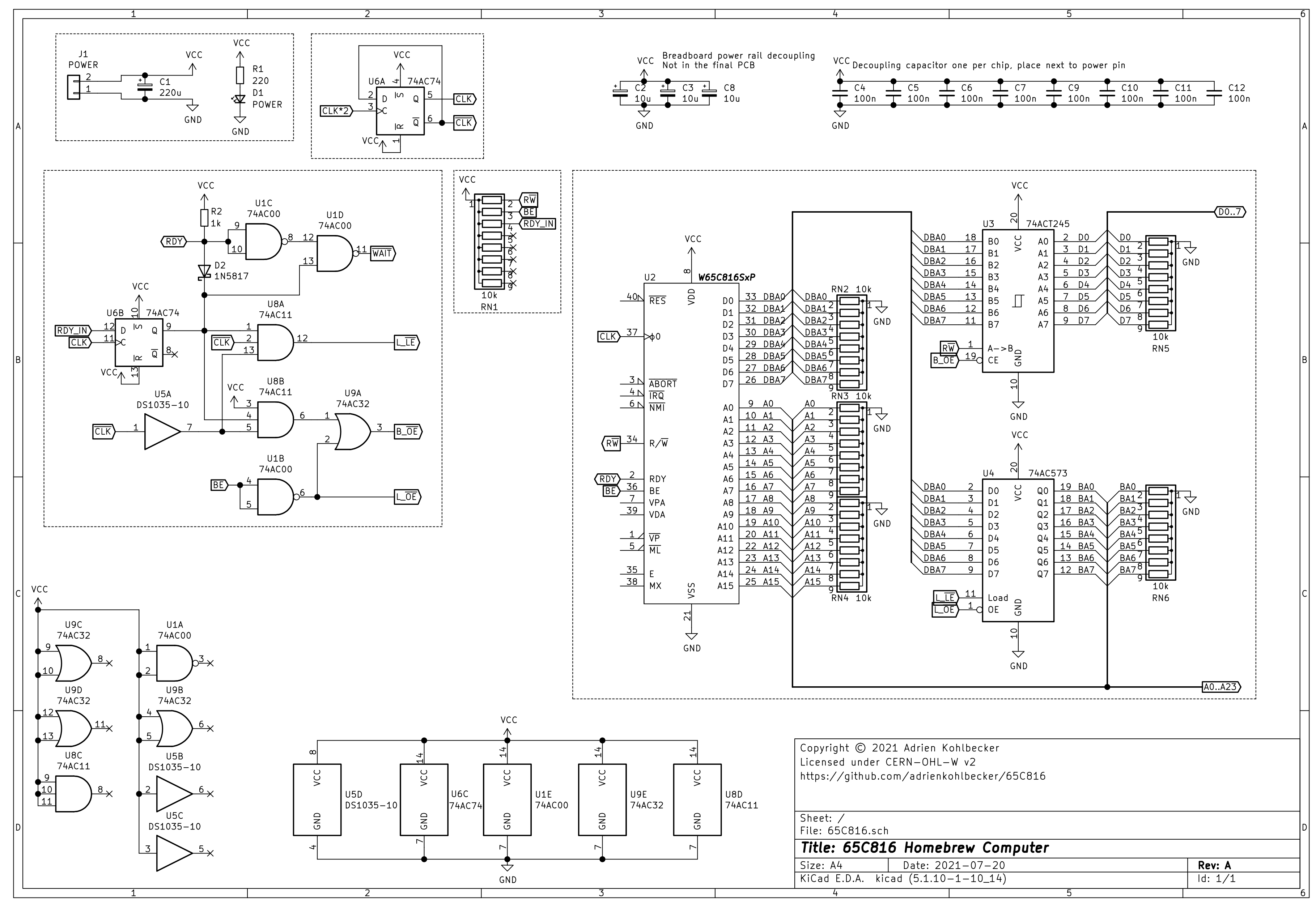 The goal of the project is to build a 65C816 development platform and learn about the CPU. I'm not going for ludicrous speed and features for revision A, here are the goals: