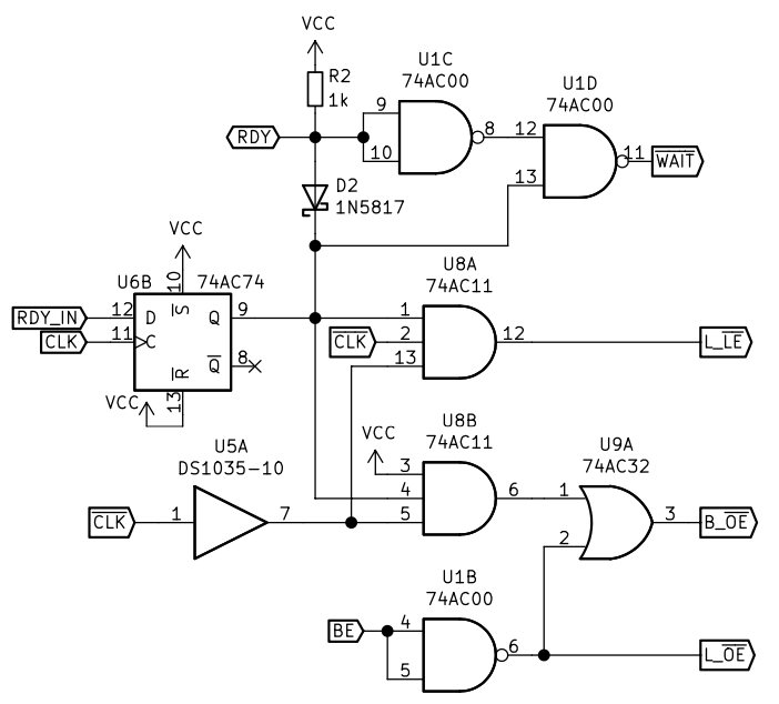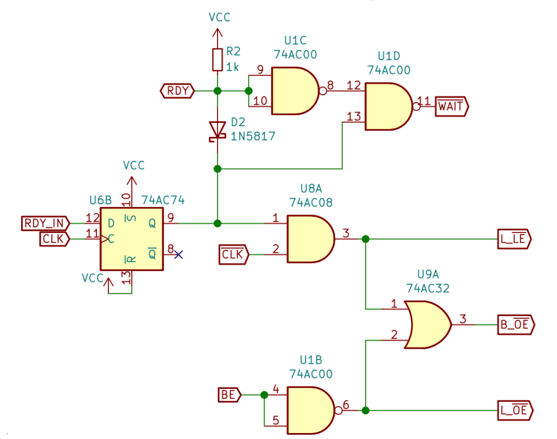 At this point in time, I'm exploring the Data Bus / Bank Address demultiplexing circuit, and improving the one shown in the datasheet by making it work in more situations (using BE, RDY). The next steps are to build a clock and reset circuit, and add memory.