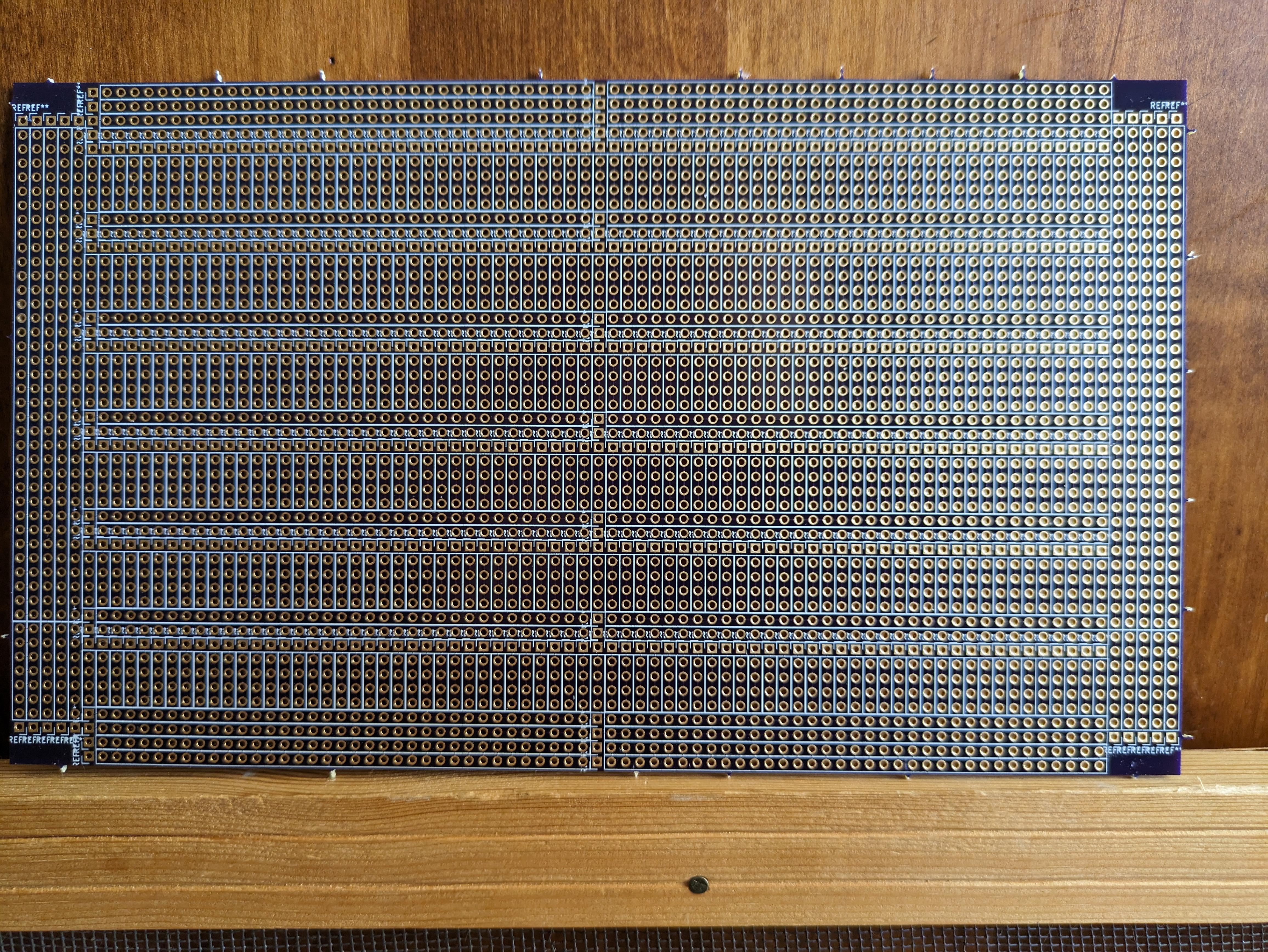 Note that I rearranged the placement of the NVRAM byte editor module to make room for the future LED display module driver module. This was easy since the byte editor only has connections to the hexadecimal keypad module, and is independent of everything else. I did need to improve the power/ground wiring network some more, mainly since the clock module only had a single connection each to ground and 5v that was too far from the modules it was not directly connected too. So I connected it at all four corners to all four modules that it talks to, respectively. So I’m still good to go running all these modules at 12.5875 MHz as they spread out more and more in the build-out process. Eventually I will be converting the designs that seem stable and are “keepers” to soldered bread boards. I’ve ordered a bunch of Samtek SSA-132-W-G stacking “shield” type headers to make a vertical stack of well-connected modules. I’ll either use my initial breadboard design that I got three of from OSH Park, or refine it a bit first and do another run. Here is the manufactured board: