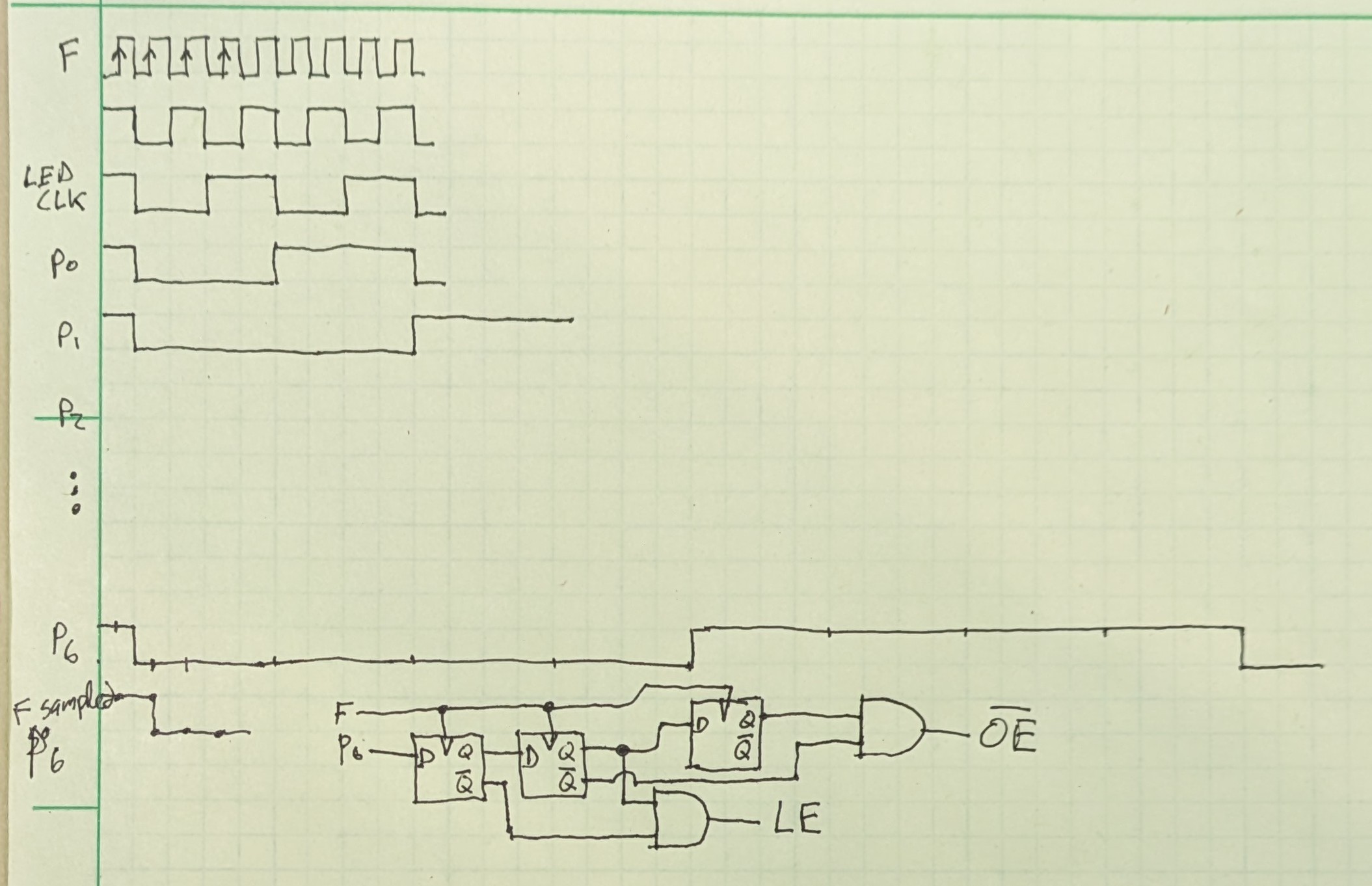 The idea is to clock in 128 pairs of pixel data (two pixels in two rows are loaded per clock pulse), then, while the clock pulse is low just after this finishes, generate a positive latch pulse and a positive output enable pulse (OE is active low, but latches with a positive pulse). So there is a kind of double latching sequence going on. The neat things about this timing circuit are: 1) it does not require any timing gap between transmitting double rows, and 2) it uses only two chips (in the context of having the power-of-two set of clocks from the clock module) – a 74F175 acting as a serial-in-parallel-out shift register, with positive and inverted outputs, and a 74F08 positive AND gate. The use of the flip flop to sample the MSB pixel count signal serves to grab the count signal at a safe/stable point in time, not right at the count signal edge in other words.