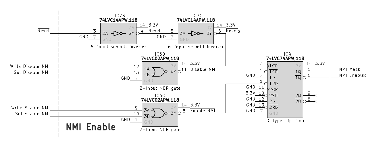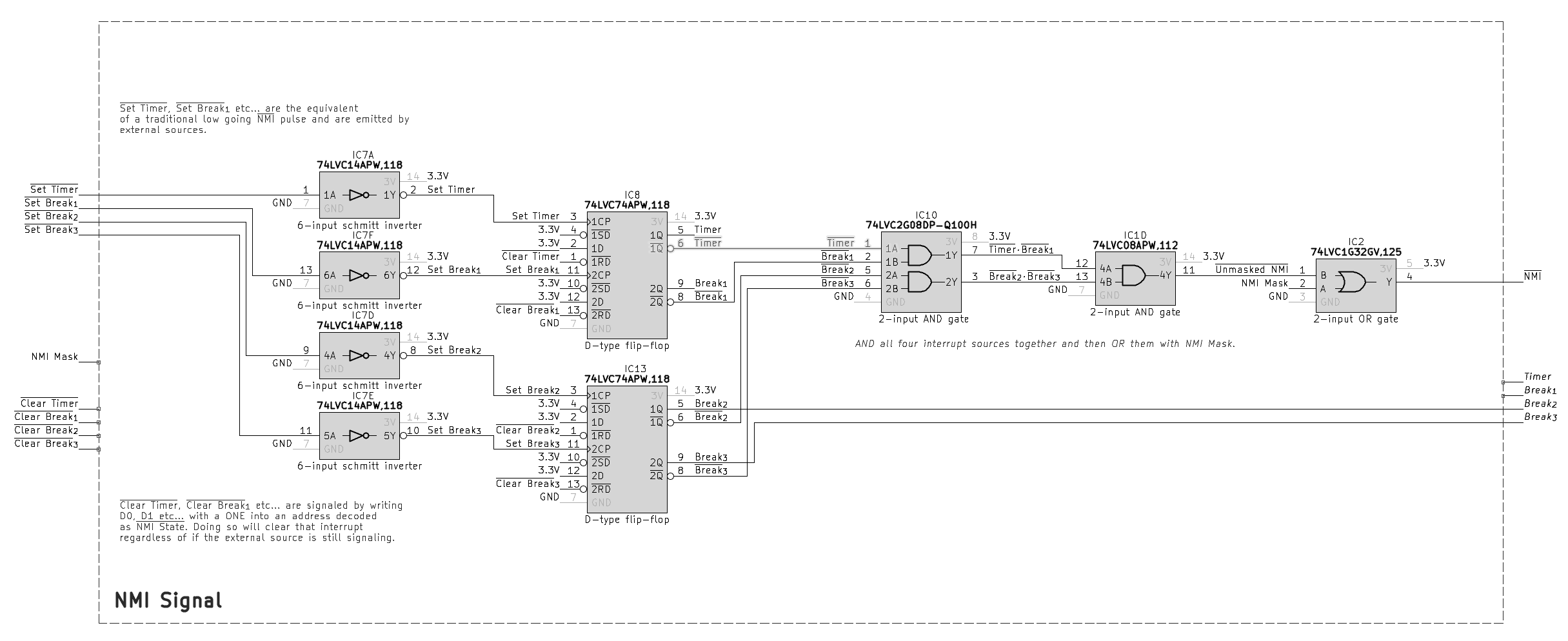 However there are four NMI sources and so four flip-flops; all of those outputs must be ANDed together. If I reduced it to two sources then I'd be able to remove at least two ICs. But. This is for the fun of it so I'm happy to go overboard.