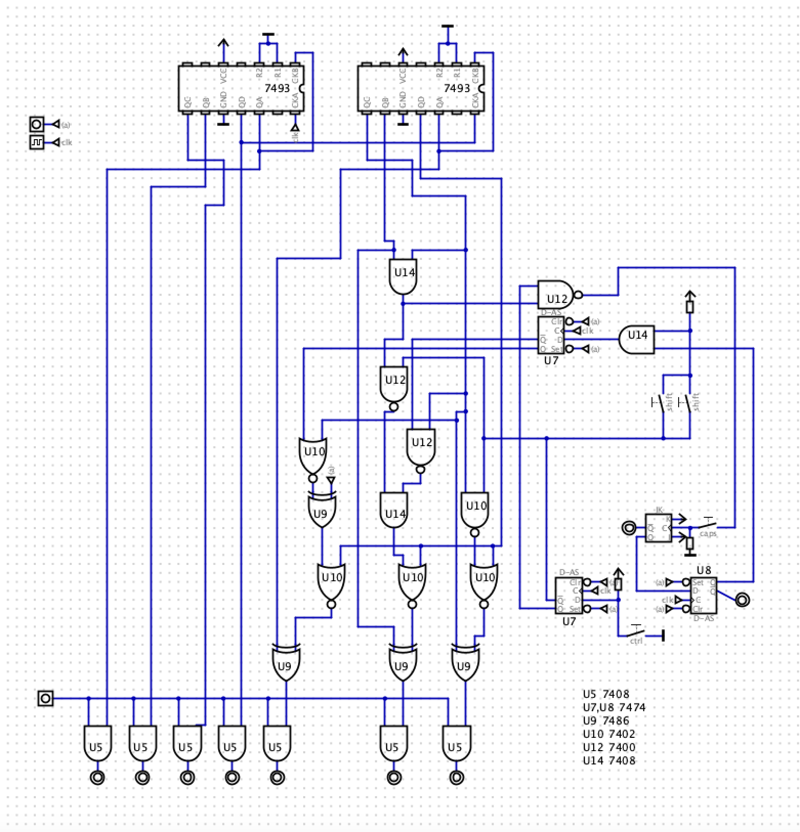 I have a working simulation made in Digital but it doesn't take bit-5 into account yet and the clock circuit is not there yet I wanted to keep it as simple as possible and just focus on the shift/caps lock and control logic. Here is an screenshot taken from the simulation. It has tests and they all pass but the implementation is not correct. Perhaps someone has some tips or suggestions.