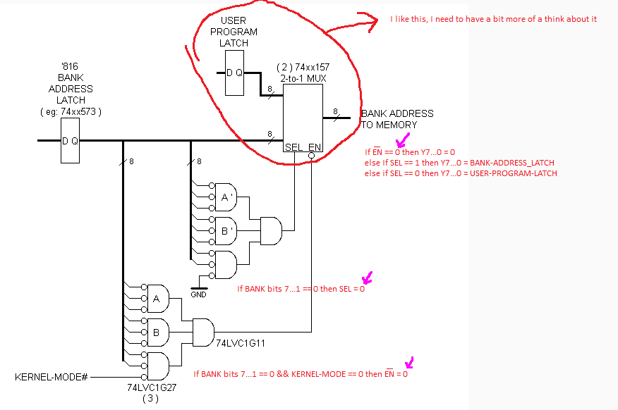 Kinda but I also want to be able to read and write to it as normal memory when in Kernal mode. And that makes things complicated. I'm not sure it's worth the complexity yet so I'll quote your schematic when I post a thread on the private memory workings. On that, the reason I'm using 128K private SRAM is because I have a bunch of IS63WV1288DBLL-10TLIs knocking about. Quite fortunate as that gives me 64K for the kernal and 64K for the User-Bank map.