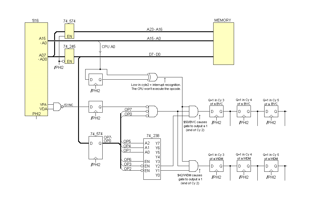 Again absolutely! I'm assuming it's going to something along the lines VPA & VDA & PHI2-is-about-to-go-low & (D == 0 | D == 2). If you could give me a few pointers on how to practically do that that'd be great. I get the feeling there may be timing gremlins in there. (Actually I had a walk after typing this and realised I only need to detect the BRK or COP before the stack manipulation cycles start so the timing might not be that tricky).