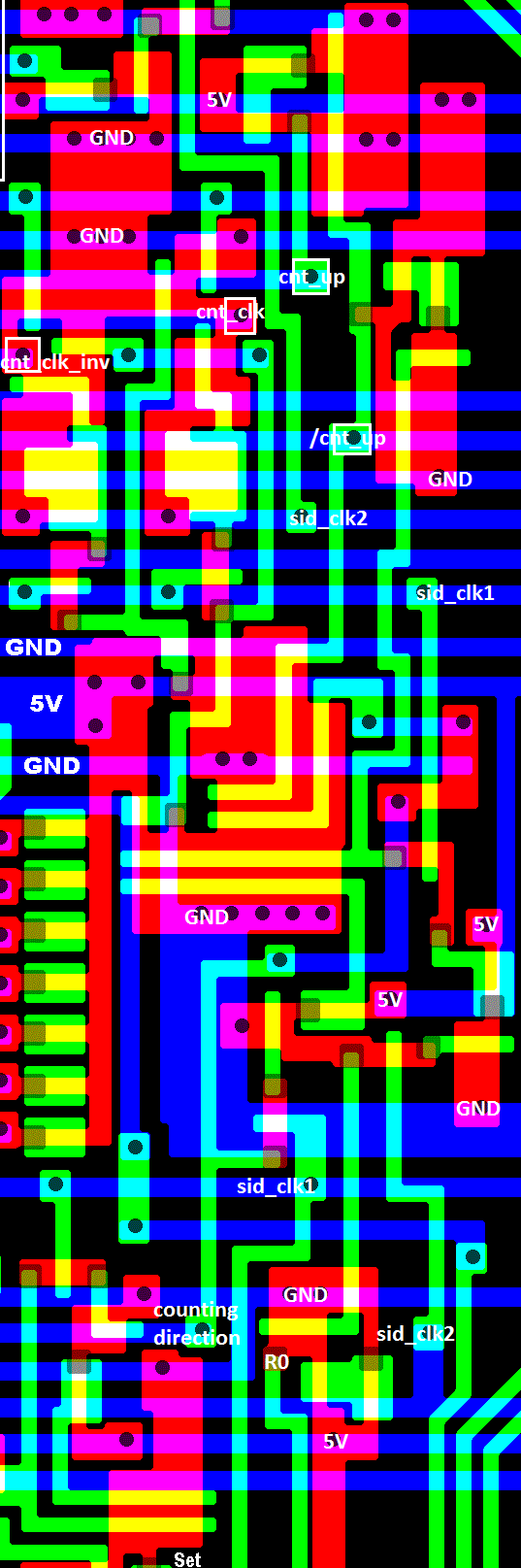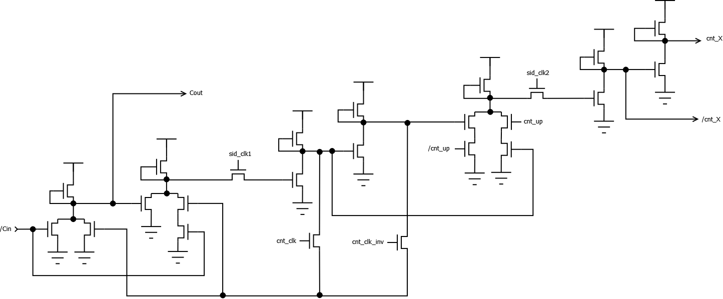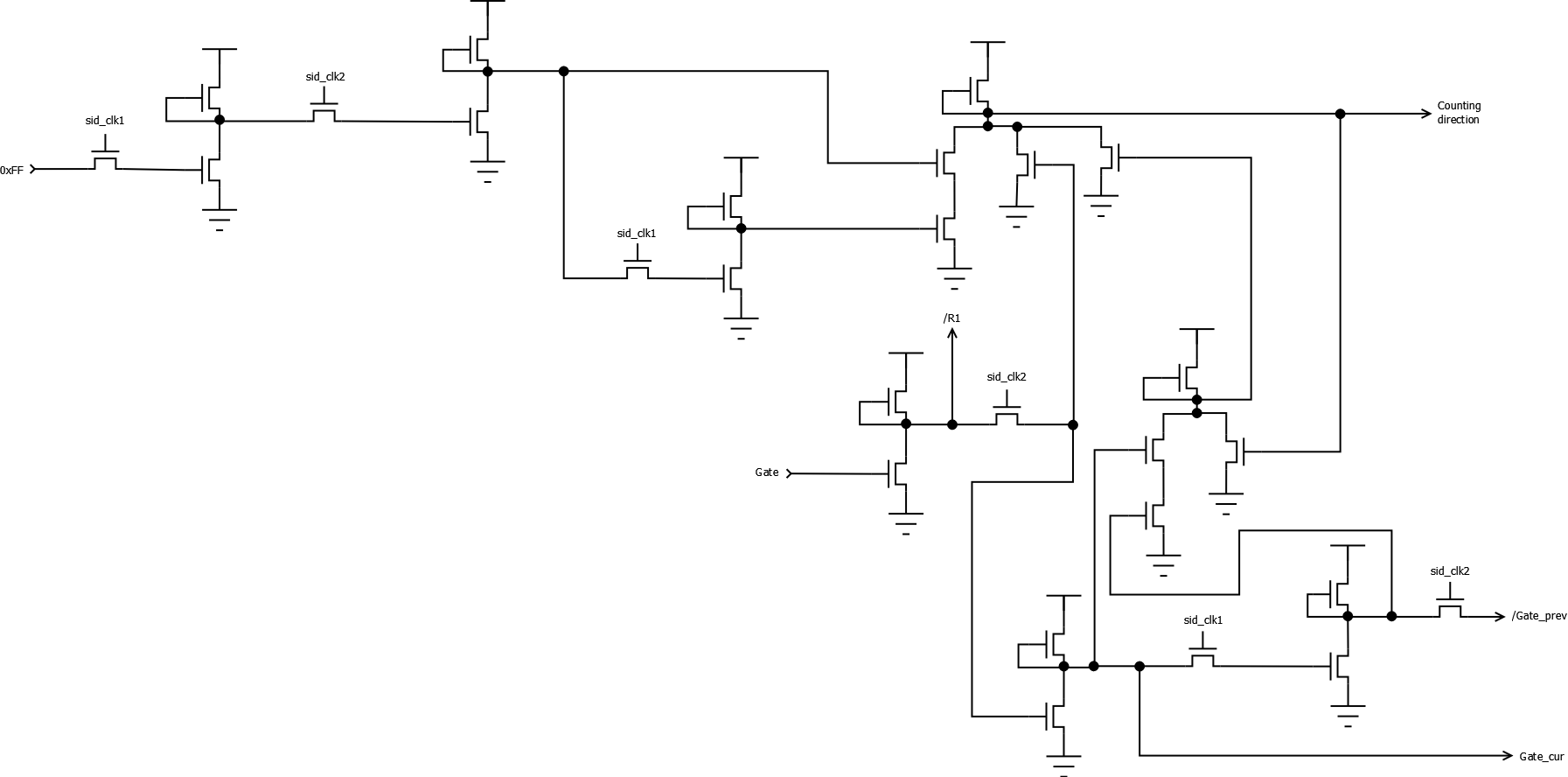 The cnt_clk and cnt_clk_inv signals are derived through an XOR gate, that checks when counting_direction has changed from the previous clock cycle, and two NOR ports, that make one of the signals active during the sid_clk2 phase based on the XOR output. The result is that cnt_clk_inv is high only the cycle after counting_direction has changed.