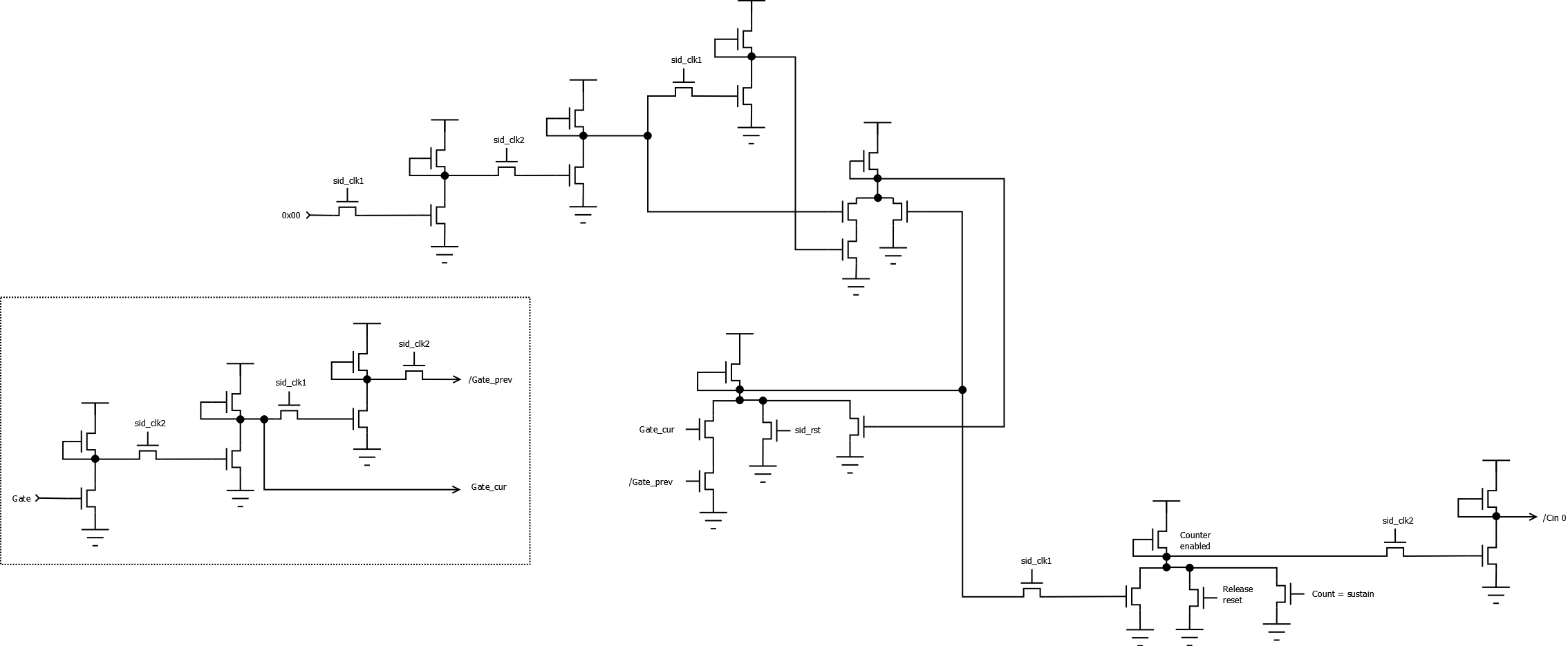 One interesting "feature" of this logic is that when the counter is locked at $00, by switching on the gate and then turning it off before the counter is clocked again the envelope will count down wrapping to $ff until it gets back to $00.