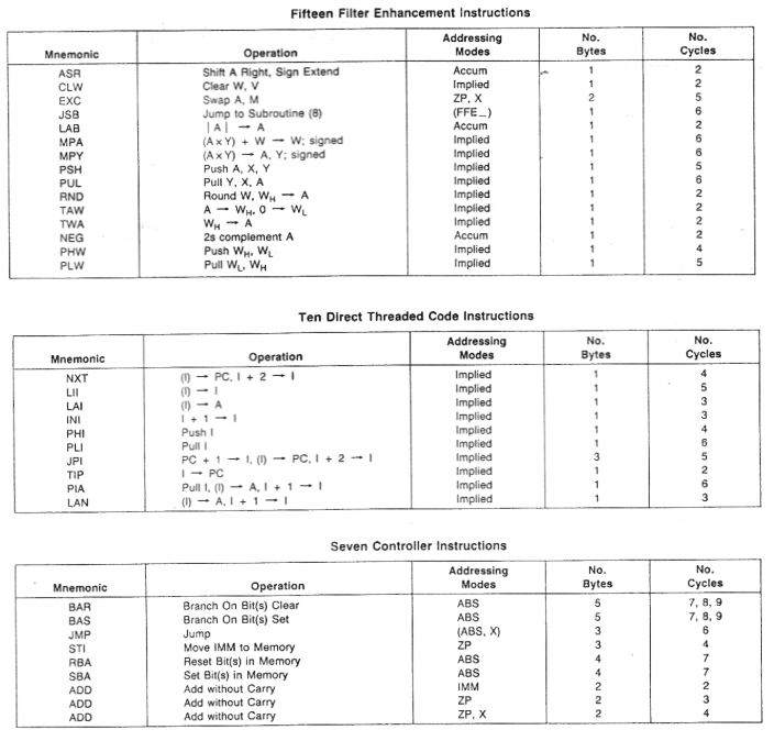 - extra instructions - see below - for support of threaded interpreted languages, for arithmetic including multiplication, swap, multiple register push and pull, one-byte subroutine calls (8 available, vectored through ROM)